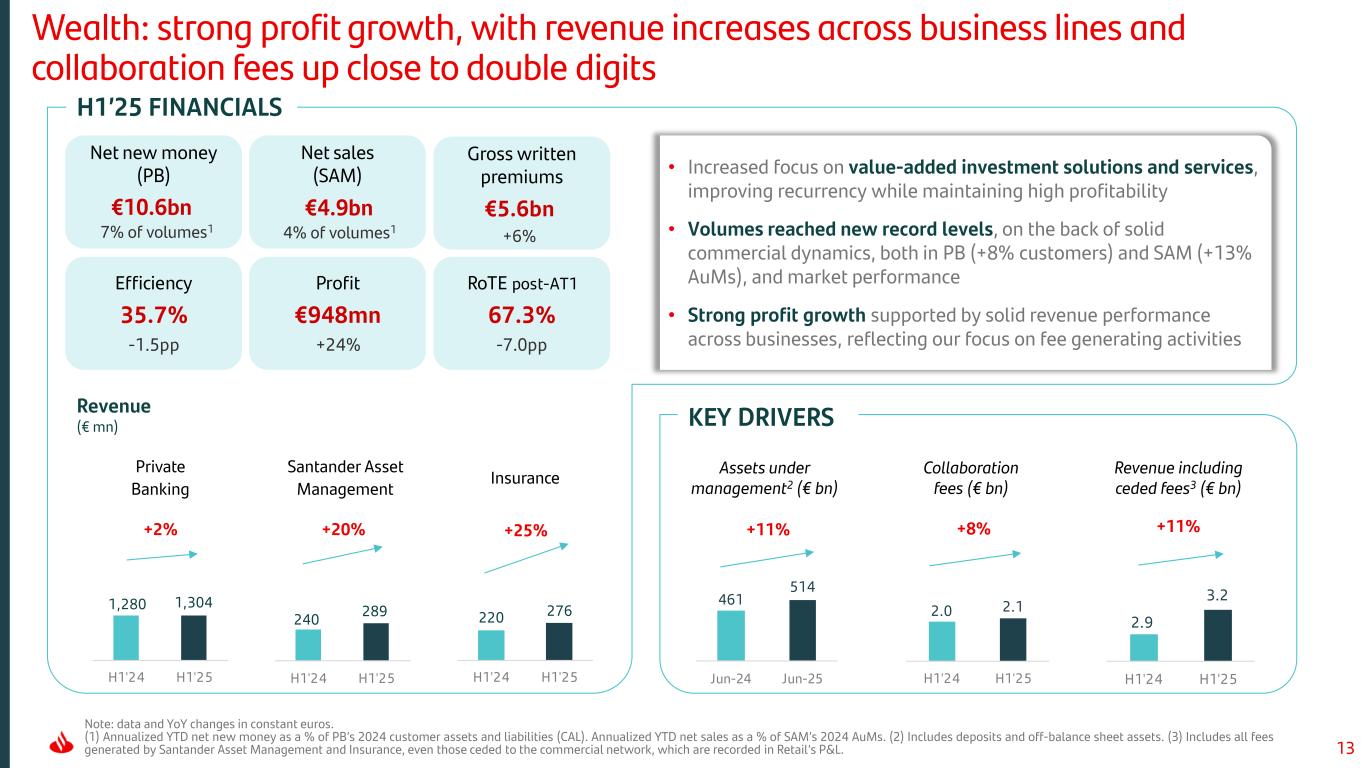 12Note: data and YoY changes in constant euros. H1’25 FINANCIALS KEY DRIVERS % customer related revenue Fee growth (€ bn) % Total revenue / RWAs CIB: improvement in profitability driven by 9% fee growth year-on-year • Solid execution of our strategy focused on fees and capital-light business, driving RoTE above 20%, while we maintain a leading position in efficiency • Strong activity YoY mainly driven by our growth initiatives in Global Markets. Good performance across our footprint. Corporate Finance continued to gain scale in the US • Profit up double-digits with solid performances across all business lines, driven by all-time high revenue, mainly fees (also record) Recurrency performance (€ mn, % vs. H1’24) CostsFees Loans €135bn -2% Deposits €125bn 0% CoR 0.09% -6bps Efficiency 43.7% +0.4pp Profit €1,534mn +15% RoTE post-AT1 20.8% +2.7pp 855 900 957 1,010 935 967 Q1'24 Q2 Q3 Q4 Q1'25 Q2 1.2 1.4 H1'24 H1'25 +9% 635 608 610 650 705 647 Q1'24 Q2 Q3 Q4 Q1'25 Q2 +9% +8% 81 79 H1'24 H1'25 In real terms +5% +1.1pp 6.9 8.0 H1'24 H1'25