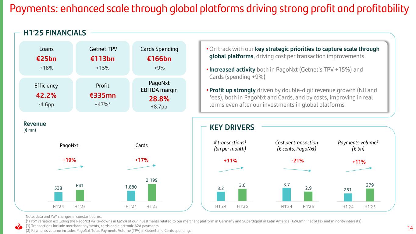 13 H1’25 FINANCIALS Note: data and YoY changes in constant euros. (1) Annualized YTD net new money as a % of PB’s 2024 customer assets and liabilities (CAL). Annualized YTD net sales as a % of SAM’s 2024 AuMs. (2) Includes deposits and off-balance sheet assets. (3) Includes all fees generated by Santander Asset Management and Insurance, even those ceded to the commercial network, which are recorded in Retail’s P&L. Private Banking Santander Asset Management Insurance Assets under management2 (€ bn) Collaboration fees (€ bn) Revenue including ceded fees3 (€ bn) KEY DRIVERS Revenue (€ mn) • Increased focus on value-added investment solutions and services, improving recurrency while maintaining high profitability • Volumes reached new record levels, on the back of solid commercial dynamics, both in PB (+8% customers) and SAM (+13% AuMs), and market performance • Strong profit growth supported by solid revenue performance across businesses, reflecting our focus on fee generating activities Wealth: strong profit growth, with revenue increases across business lines and collaboration fees up close to double digits Net new money (PB) Net sales (SAM) Gross written premiums Efficiency 35.7% -1.5pp Profit €948mn +24% RoTE post-AT1 67.3% -7.0pp €5.6bn +6% 2.0 2.1 H1'24 H1'25 240 289 H1'24 H1'25 220 276 H1'24 H1'25 1,280 1,304 H1'24 H1'25 461 514 Jun-24 Jun-25 2.9 3.2 H1'24 H1'25 +2% +20% +25% +8%+11% +11% €10.6bn 7% of volumes1 €4.9bn 4% of volumes1