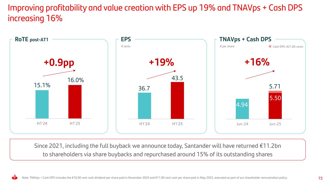 14 Note: data and YoY changes in constant euros. (*) YoY variation excluding the PagoNxt write-downs in Q2’24 of our investments related to our merchant platform in Germany and Superdigital in Latin America (€243mn, net of tax and minority interests). (1) Transactions include merchant payments, cards and electronic A2A payments. (2) Payments volume includes PagoNxt Total Payments Volume (TPV) in Getnet and Cards spending. H1’25 FINANCIALS # transactions1 (bn per month) Cost per transaction (€ cents, PagoNxt) Payments volume2 (€ bn) PagoNxt Cards KEY DRIVERS Revenue (€ mn) •On track with our key strategic priorities to capture scale through global platforms, driving cost per transaction improvements • Increased activity both in PagoNxt (Getnet’s TPV +15%) and Cards (spending +9%) •Profit up strongly driven by double-digit revenue growth (NII and fees), both in PagoNxt and Cards, and by costs, improving in real terms even after our investments in global platforms PagoNxt EBITDA margin Loans €25bn +18% Getnet TPV €113bn +15% Cards Spending €166bn +9% Efficiency 42.2% -4.6pp Profit €335mn +47%* 28.8% +8.7pp 3.2 3.6 H1'24 H1'25 3.7 2.9 H1'24 H1'25 538 641 H1'24 H1'25 1,880 2,199 H1'24 H1'25 251 279 H1'24 H1'25 +11%+11% -21%+19% +17% Payments: enhanced scale through global platforms driving strong profit and profitability