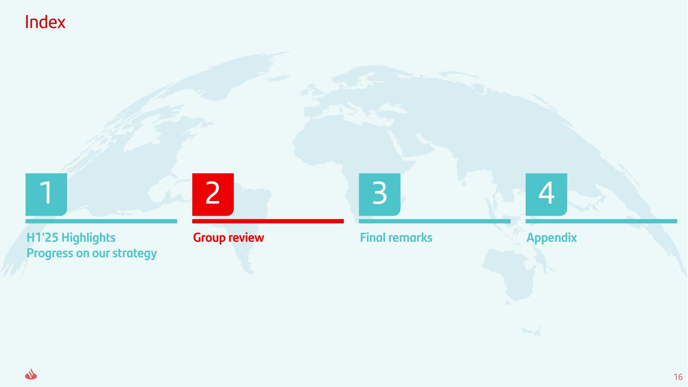 15 15.1% 16.0% H1'24 H1'25 Note: TNAVps + Cash DPS includes the €10.00 cent cash dividend per share paid in November 2024 and €11.00 cent cash per share paid in May 2025, executed as part of our shareholder remuneration policy. Improving profitability and value creation with EPS up 19% and TNAVps + Cash DPS increasing 16% Since 2021, including the full buyback we announce today, Santander will have returned €11.2bn to shareholders via share buybacks and repurchased around 15% of its outstanding shares RoTE post-AT1 EPS TNAVps + Cash DPS € per share Cash DPS: €21.00 cents€ cents 4.94 5.50 5.71 Jun-24 Jun-25 36.7 43.5 H1'24 H1'25 +0.9pp +19% +16%