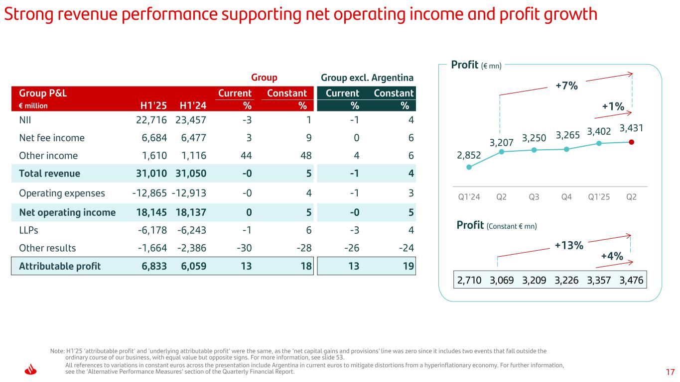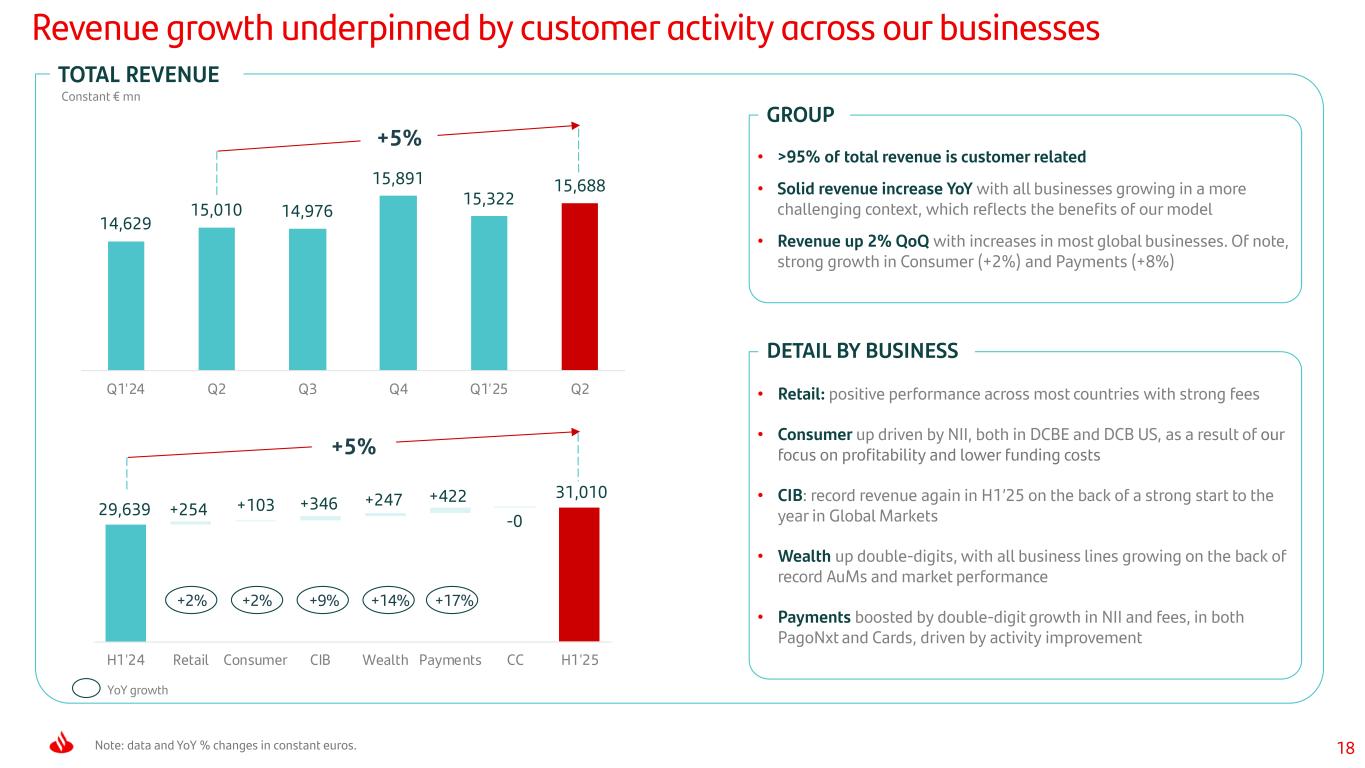 17 +4% 2,852 3,207 3,250 3,265 3,402 3,431 Q1'24 Q2 Q3 Q4 Q1'25 Q2 +1% +7% Profit (€ mn) 2,710 3,069 3,209 3,226 3,357 3,476 Strong revenue performance supporting net operating income and profit growth Profit (Constant € mn) +13% Note: H1’25 ‘attributable profit' and 'underlying attributable profit’ were the same, as the ‘net capital gains and provisions’ line was zero since it includes two events that fall outside the ordinary course of our business, with equal value but opposite signs. For more information, see slide 53. All references to variations in constant euros across the presentation include Argentina in current euros to mitigate distortions from a hyperinflationary economy. For further information, see the ‘Alternative Performance Measures’ section of the Quarterly Financial Report. Group P&L Current Constant Current Constant € million H1'25 H1'24 % % % % NII 22,716 23,457 -3 1 -1 4 Net fee income 6,684 6,477 3 9 0 6 Other income 1,610 1,116 44 48 4 6 Total revenue 31,010 31,050 -0 5 -1 4 Operating expenses -12,865 -12,913 -0 4 -1 3 Net operating income 18,145 18,137 0 5 -0 5 LLPs -6,178 -6,243 -1 6 -3 4 Other results -1,664 -2,386 -30 -28 -26 -24 Attributable profit 6,833 6,059 13 18 13 19 Group excl. ArgentinaGroup