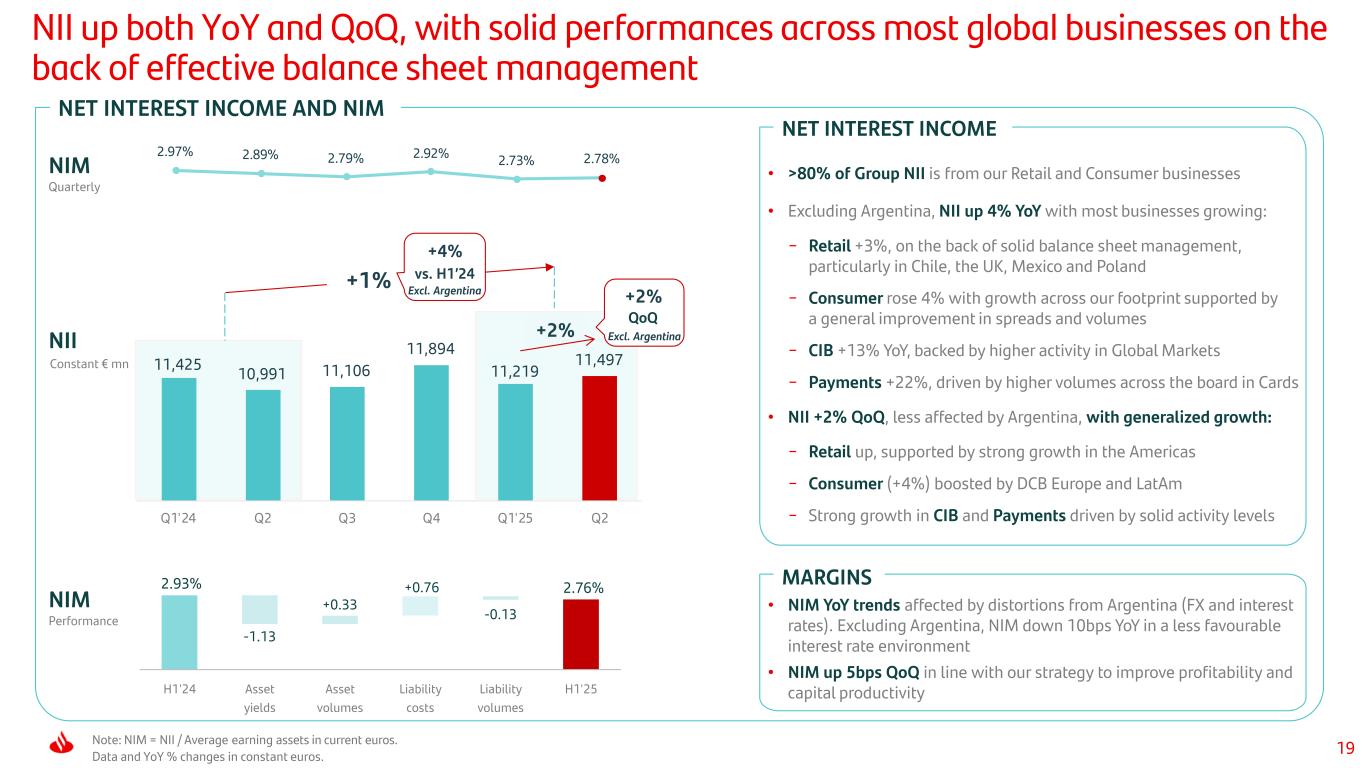 18 31,010 29,639 +254 +103 +346 +247 +422 -0 H1'24 Retail Consumer CIB Wealth Payments CC H1'25 Revenue growth underpinned by customer activity across our businesses Note: data and YoY % changes in constant euros. YoY growth TOTAL REVENUE • >95% of total revenue is customer related • Solid revenue increase YoY with all businesses growing in a more challenging context, which reflects the benefits of our model • Revenue up 2% QoQ with increases in most global businesses. Of note, strong growth in Consumer (+2%) and Payments (+8%) GROUP • Retail: positive performance across most countries with strong fees • Consumer up driven by NII, both in DCBE and DCB US, as a result of our focus on profitability and lower funding costs • CIB: record revenue again in H1’25 on the back of a strong start to the year in Global Markets • Wealth up double-digits, with all business lines growing on the back of record AuMs and market performance • Payments boosted by double-digit growth in NII and fees, in both PagoNxt and Cards, driven by activity improvement DETAIL BY BUSINESS Constant € mn 14,629 15,010 14,976 15,891 15,322 15,688 Q1'24 Q2 Q3 Q4 Q1'25 Q2 +2% +2% +9% +14% +17% +5% +5%