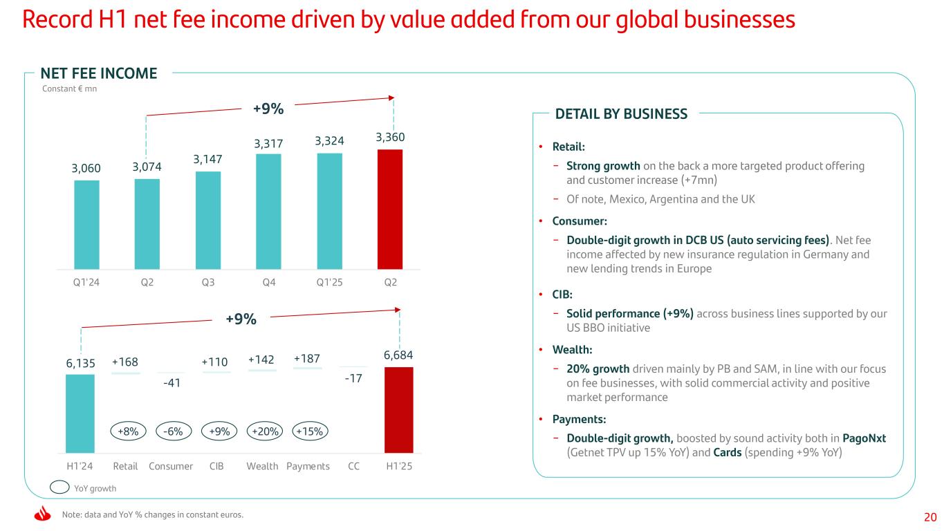 19 +2% 2.97% 2.89% 2.79% 2.92% 2.73% 2.78% +1% Excl. Argentina vs. H1’24 +4% NII up both YoY and QoQ, with solid performances across most global businesses on the back of effective balance sheet management NIM Performance NII NET INTEREST INCOME AND NIM Note: NIM = NII / Average earning assets in current euros. Data and YoY % changes in constant euros. NIM Quarterly Constant € mn 2.76% -1.13 -0.13 2.93% +0.33 +0.76 H1'24 Asset yields Asset volumes Liability costs Liability volumes H1'25 • >80% of Group NII is from our Retail and Consumer businesses • Excluding Argentina, NII up 4% YoY with most businesses growing: − Retail +3%, on the back of solid balance sheet management, particularly in Chile, the UK, Mexico and Poland − Consumer rose 4% with growth across our footprint supported by a general improvement in spreads and volumes − CIB +13% YoY, backed by higher activity in Global Markets − Payments +22%, driven by higher volumes across the board in Cards • NII +2% QoQ, less affected by Argentina, with generalized growth: − Retail up, supported by strong growth in the Americas − Consumer (+4%) boosted by DCB Europe and LatAm − Strong growth in CIB and Payments driven by solid activity levels NET INTEREST INCOME • NIM YoY trends affected by distortions from Argentina (FX and interest rates). Excluding Argentina, NIM down 10bps YoY in a less favourable interest rate environment • NIM up 5bps QoQ in line with our strategy to improve profitability and capital productivity MARGINS Excl. Argentina QoQ +2% 11,425 10,991 11,106 11,894 11,219 11,497 Q1'24 Q2 Q3 Q4 Q1'25 Q2