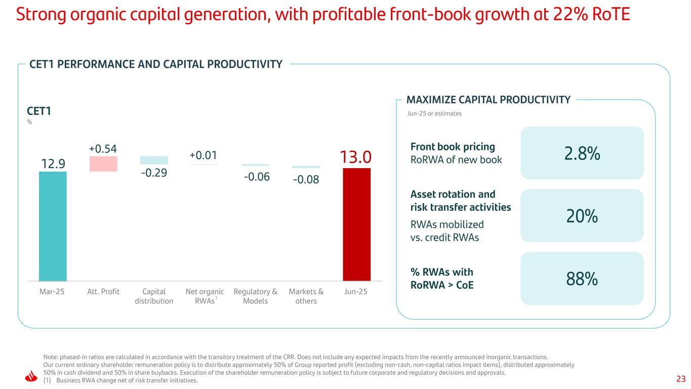 23 13.0 -0.29 -0.06 -0.08 12.9 +0.54 +0.01 Mar-25 Att. Profit Capital distribution Net organic RWAs Regulatory & Models Markets & others Jun-25 Strong organic capital generation, with profitable front-book growth at 22% RoTE CET1 % Jun-25 or estimates Front book pricing RoRWA of new book Asset rotation and risk transfer activities RWAs mobilized vs. credit RWAs % RWAs with RoRWA > CoE CET1 PERFORMANCE AND CAPITAL PRODUCTIVITY MAXIMIZE CAPITAL PRODUCTIVITY 2.8% 20% 88% 1 Note: phased-in ratios are calculated in accordance with the transitory treatment of the CRR. Does not include any expected impacts from the recently announced inorganic transactions. Our current ordinary shareholder remuneration policy is to distribute approximately 50% of Group reported profit (excluding non-cash, non-capital ratios impact items), distributed approximately 50% in cash dividend and 50% in share buybacks. Execution of the shareholder remuneration policy is subject to future corporate and regulatory decisions and approvals. (1) Business RWA change net of risk transfer initiatives.
