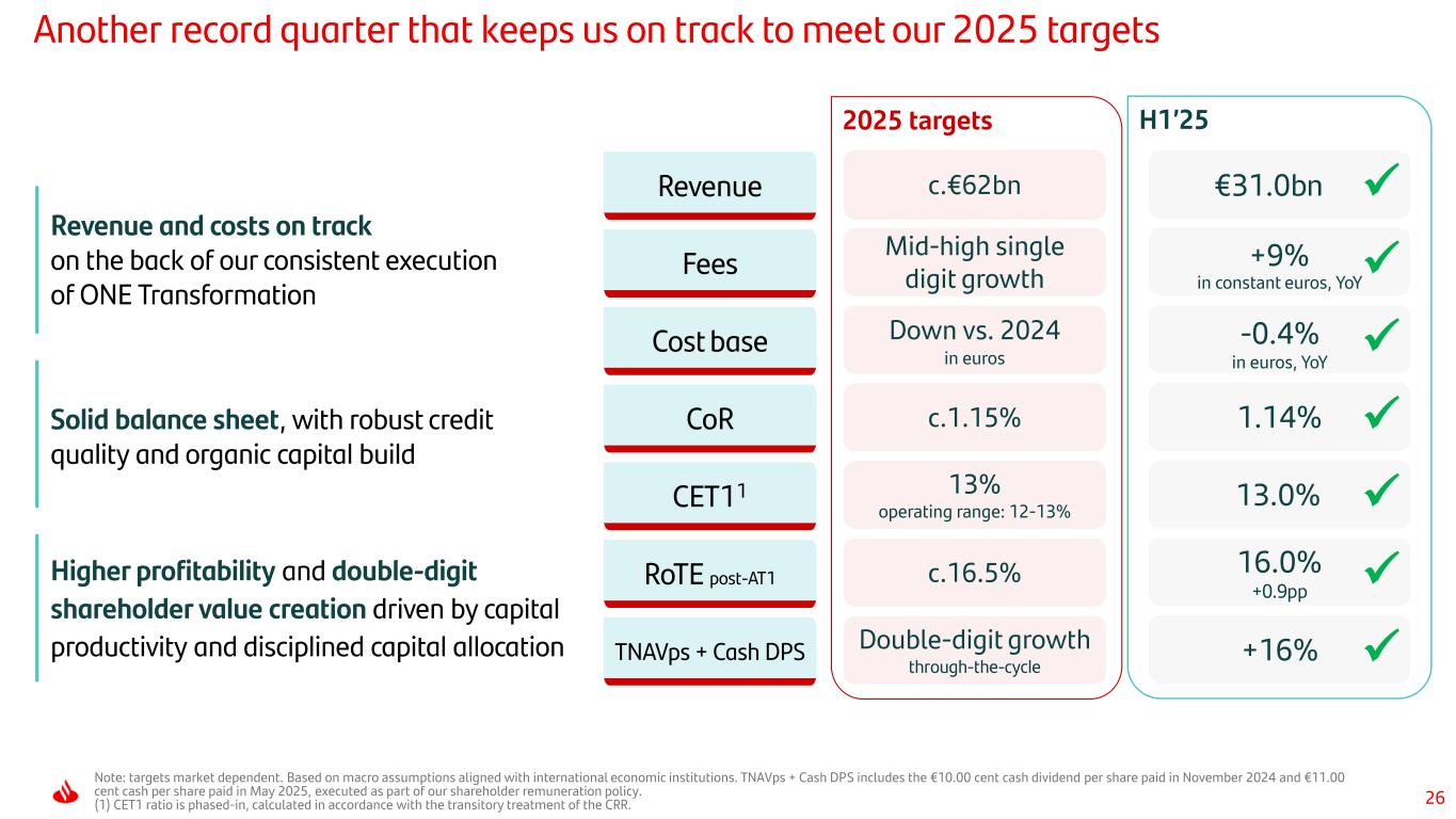 24 Value accretive capital redeployment is a top priority: our recent inorganic transactions are consistent with our strict capital hierarchy criteria Improved our SBB target: at least €10bn in share buybacks for 2025 and 2026 earnings1 Accelerate the €10bn SBB execution1 using 50% of the proceeds of Poland disposal to early 2026 Bolt-on TSB acquisition with RoIC above 20%4, EPS accretive from year one (c.4% in 2028) USE OF CAPITAL PROCEEDS FROM POLAND DISPOSAL AT 3X INITIAL INVESTMENT For more information, see notes on slide 57. 1 2 3 13-50bps c.-50bps 13 c.+100bps 2025 Standalone target Poland disposal Aprox. €3.2bn share buyback post Poland TSB acquisition 2025 Pro forma CET1 CET1 %