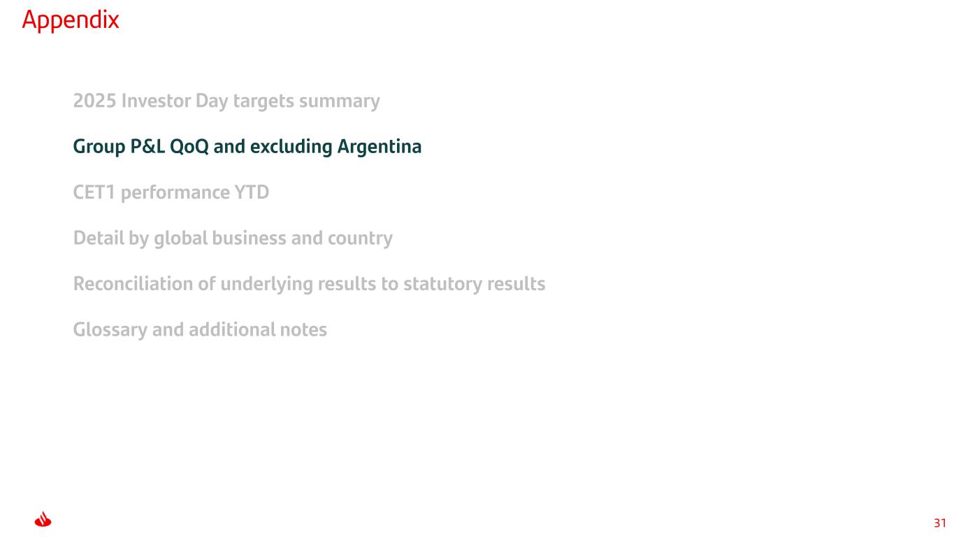 29 Appendix 2025 Investor Day targets summary Group P&L QoQ and excluding Argentina CET1 performance YTD Detail by global business and country Reconciliation of underlying results to statutory results Glossary and additional notes