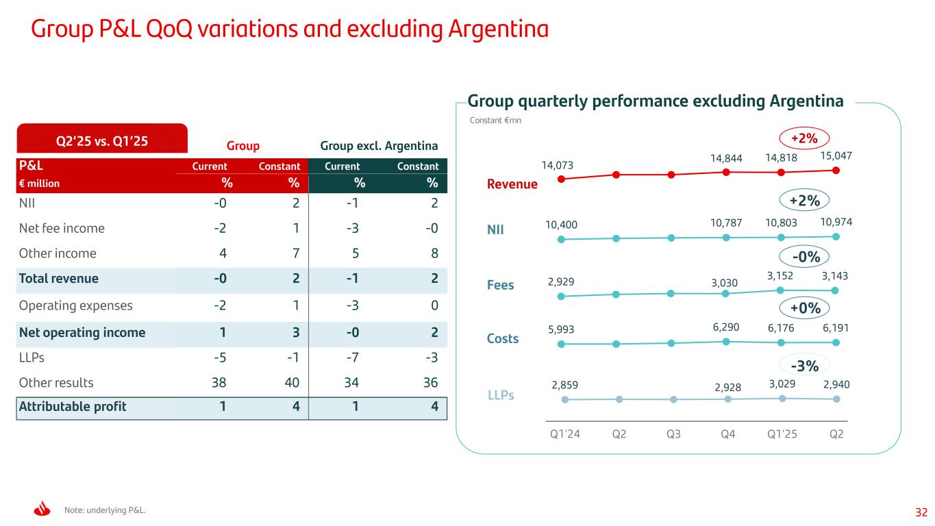 31 Appendix 2025 Investor Day targets summary Group P&L QoQ and excluding Argentina CET1 performance YTD Detail by global business and country Reconciliation of underlying results to statutory results Glossary and additional notes
