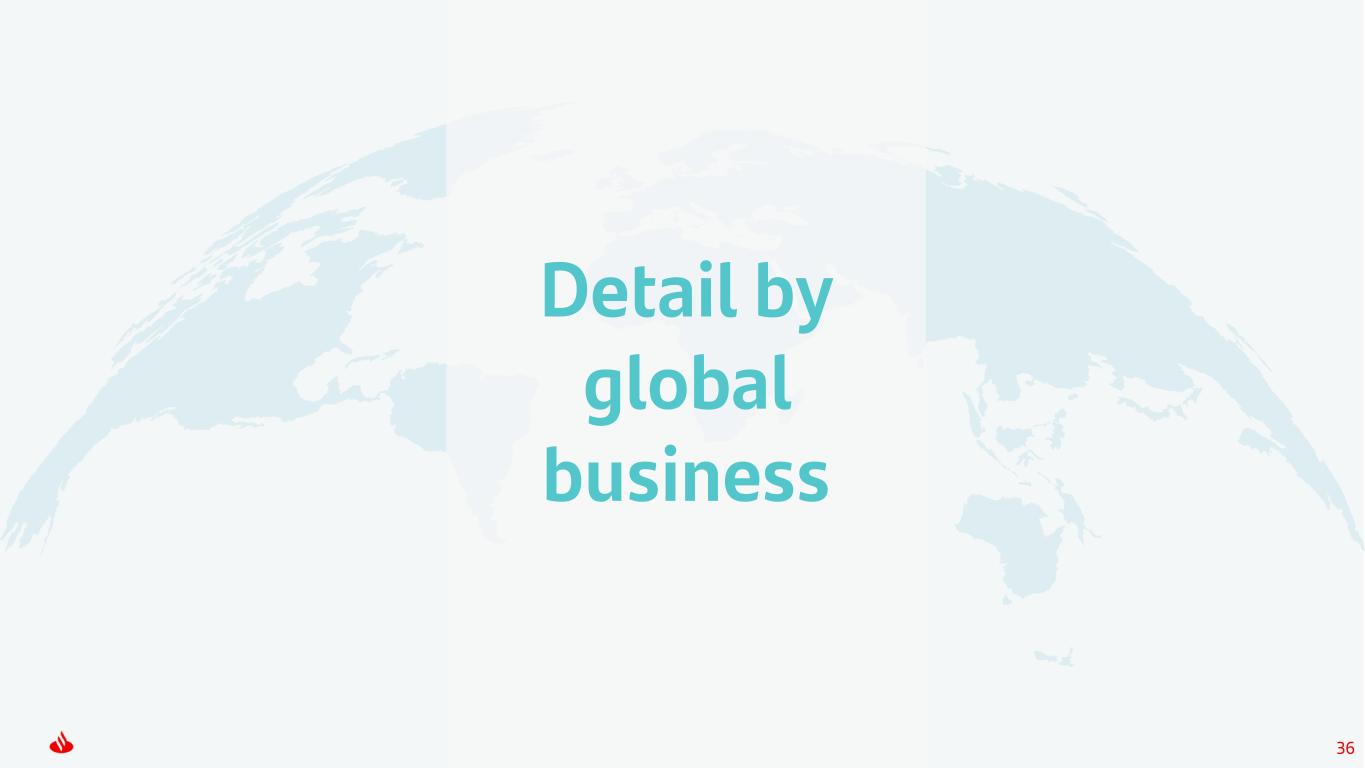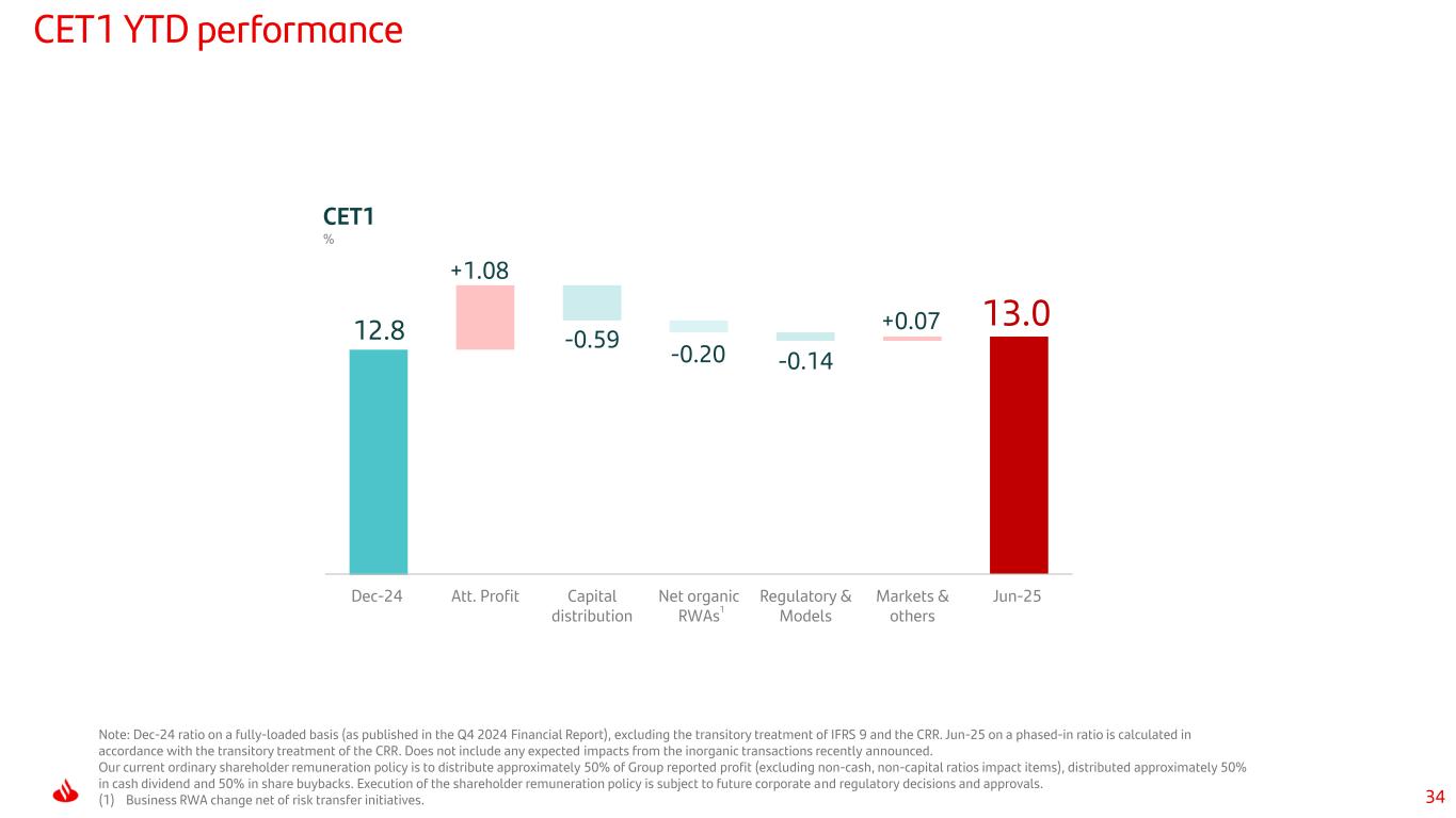 34 13.0 -0.59 -0.20 -0.14 12.8 +1.08 +0.07 Dec-24 Att. Profit Capital distribution Net organic RWAs Regulatory & Models Markets & others Jun-25 CET1 YTD performance CET1 % 1 Note: Dec-24 ratio on a fully-loaded basis (as published in the Q4 2024 Financial Report), excluding the transitory treatment of IFRS 9 and the CRR. Jun-25 on a phased-in ratio is calculated in accordance with the transitory treatment of the CRR. Does not include any expected impacts from the inorganic transactions recently announced. Our current ordinary shareholder remuneration policy is to distribute approximately 50% of Group reported profit (excluding non-cash, non-capital ratios impact items), distributed approximately 50% in cash dividend and 50% in share buybacks. Execution of the shareholder remuneration policy is subject to future corporate and regulatory decisions and approvals. (1) Business RWA change net of risk transfer initiatives.