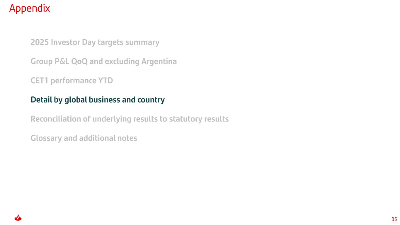 33 Appendix 2025 Investor Day targets summary Group P&L QoQ and excluding Argentina CET1 performance YTD Detail by global business and country Reconciliation of underlying results to statutory results Glossary and additional notes
