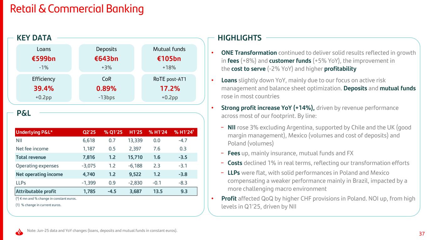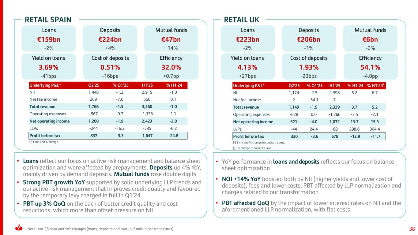37 KEY DATA Retail & Commercial Banking Note: Jun-25 data and YoY changes (loans, deposits and mutual funds in constant euros). P&L HIGHLIGHTS Loans €599bn -1% Mutual funds €105bn +18% Efficiency 39.4% +0.2pp CoR 0.89% -13bps RoTE post-AT1 17.2% +0.2pp Deposits €643bn +3% Underlying P&L* Q2'25 % Q1'25 H1'25 % H1'24 % H1'24¹ NII 6,618 0.7 13,339 0.0 -4.7 Net fee income 1,187 0.5 2,397 7.6 0.3 Total revenue 7,816 1.2 15,710 1.6 -3.5 Operating expenses -3,075 1.2 -6,188 2.3 -3.1 Net operating income 4,740 1.2 9,522 1.2 -3.8 LLPs -1,399 0.9 -2,830 -0.1 -8.3 Attributable profit 1,785 -4.5 3,687 13.5 9.3 (*) € mn and % change in constant euros. (1) % change in current euros. • ONE Transformation continued to deliver solid results reflected in growth in fees (+8%) and customer funds (+5% YoY), the improvement in the cost to serve (-2% YoY) and higher profitability • Loans slightly down YoY, mainly due to our focus on active risk management and balance sheet optimization. Deposits and mutual funds rose in most countries • Strong profit increase YoY (+14%), driven by revenue performance across most of our footprint. By line: − NII rose 3% excluding Argentina, supported by Chile and the UK (good margin management), Mexico (volumes and cost of deposits) and Poland (volumes) − Fees up, mainly insurance, mutual funds and FX − Costs declined 1% in real terms, reflecting our transformation efforts − LLPs were flat, with solid performances in Poland and Mexico compensating a weaker performance mainly in Brazil, impacted by a more challenging macro environment • Profit affected QoQ by higher CHF provisions in Poland. NOI up, from high levels in Q1’25, driven by NII