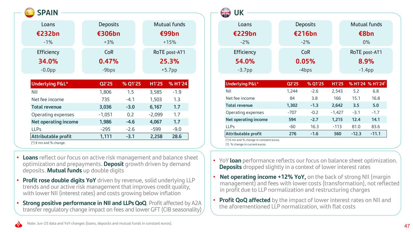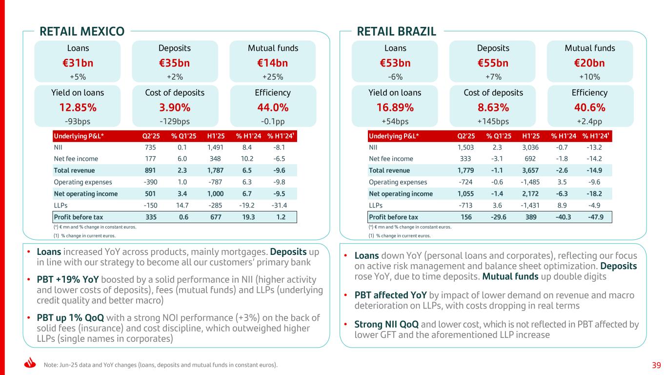 38 RETAIL SPAIN Note: Jun-25 data and YoY changes (loans, deposits and mutual funds in constant euros). RETAIL UK Underlying P&L* Q2'25 % Q1'25 H1'25 % H1'24 NII 1,448 -1.3 2,915 -1.0 Net fee income 269 -7.6 560 0.1 Total revenue 1,766 -1.5 3,560 -1.0 Operating expenses -567 -0.7 -1,138 1.1 Net operating income 1,200 -1.9 2,423 -2.0 LLPs -244 -16.3 -535 -6.2 Profit before tax 837 3.3 1,647 24.8 (*) € mn and % change. Underlying P&L* Q2'25 % Q1'25 H1'25 % H1'24 % H1'24¹ NII 1,174 -2.5 2,398 5.2 6.7 Net fee income 2 -54.1 7 — — Total revenue 1,149 -1.9 2,339 3.7 5.2 Operating expenses -628 0.0 -1,266 -3.5 -2.1 Net operating income 521 -4.0 1,072 13.7 15.3 LLPs -44 24.4 -80 298.6 304.4 Profit before tax 330 -3.6 678 -12.9 -11.7 (*) € mn and % change in constant euros. (1) % change in current euros. Loans €159bn -2% Deposits €224bn +4% Mutual funds €47bn +14% Yield on loans 3.69% -41bps Cost of deposits 0.51% -16bps Efficiency 32.0% +0.7pp Loans €223bn -2% Deposits €206bn -1% Mutual funds €6bn -2% Yield on loans 4.13% +27bps Cost of deposits 1.93% -23bps Efficiency 54.1% -4.0pp • YoY performance in loans and deposits reflects our focus on balance sheet optimization • NOI +14% YoY boosted both by NII (higher yields and lower cost of deposits), fees and lower costs. PBT affected by LLP normalization and charges related to our transformation • PBT affected QoQ by the impact of lower interest rates on NII and the aforementioned LLP normalization, with flat costs • Loans reflect our focus on active risk management and balance sheet optimization and were affected by prepayments. Deposits up 4% YoY, mainly driven by demand deposits. Mutual funds rose double digits • Strong PBT growth YoY supported by solid underlying LLP trends and our active risk management that improves credit quality and favoured by the temporary levy charged in full in Q1’24 • PBT up 3% QoQ on the back of better credit quality and cost reductions, which more than offset pressure on NII
