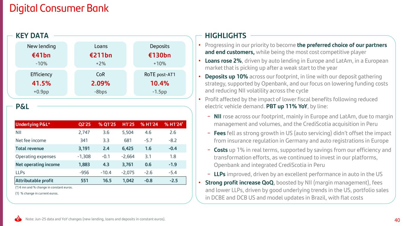 39Note: Jun-25 data and YoY changes (loans, deposits and mutual funds in constant euros). RETAIL MEXICO RETAIL BRAZIL Underlying P&L* Q2'25 % Q1'25 H1'25 % H1'24 % H1'24¹ NII 735 0.1 1,491 8.4 -8.1 Net fee income 177 6.0 348 10.2 -6.5 Total revenue 891 2.3 1,787 6.5 -9.6 Operating expenses -390 1.0 -787 6.3 -9.8 Net operating income 501 3.4 1,000 6.7 -9.5 LLPs -150 14.7 -285 -19.2 -31.4 Profit before tax 335 0.6 677 19.3 1.2 (*) € mn and % change in constant euros. (1) % change in current euros. Loans €31bn +5% Deposits €35bn +2% Mutual funds €14bn +25% Yield on loans 12.85% -93bps Cost of deposits 3.90% -129bps Efficiency 44.0% -0.1pp Loans €53bn -6% Deposits €55bn +7% Mutual funds €20bn +10% Yield on loans 16.89% +54bps Cost of deposits 8.63% +145bps Efficiency 40.6% +2.4pp Underlying P&L* Q2'25 % Q1'25 H1'25 % H1'24 % H1'24¹ NII 1,503 2.3 3,036 -0.7 -13.2 Net fee income 333 -3.1 692 -1.8 -14.2 Total revenue 1,779 -1.1 3,657 -2.6 -14.9 Operating expenses -724 -0.6 -1,485 3.5 -9.6 Net operating income 1,055 -1.4 2,172 -6.3 -18.2 LLPs -713 3.6 -1,431 8.9 -4.9 Profit before tax 156 -29.6 389 -40.3 -47.9 (*) € mn and % change in constant euros. (1) % change in current euros. • Loans increased YoY across products, mainly mortgages. Deposits up in line with our strategy to become all our customers’ primary bank • PBT +19% YoY boosted by a solid performance in NII (higher activity and lower costs of deposits), fees (mutual funds) and LLPs (underlying credit quality and better macro) • PBT up 1% QoQ with a strong NOI performance (+3%) on the back of solid fees (insurance) and cost discipline, which outweighed higher LLPs (single names in corporates) • Loans down YoY (personal loans and corporates), reflecting our focus on active risk management and balance sheet optimization. Deposits rose YoY, due to time deposits. Mutual funds up double digits • PBT affected YoY by impact of lower demand on revenue and macro deterioration on LLPs, with costs dropping in real terms • Strong NII QoQ and lower cost, which is not reflected in PBT affected by lower GFT and the aforementioned LLP increase