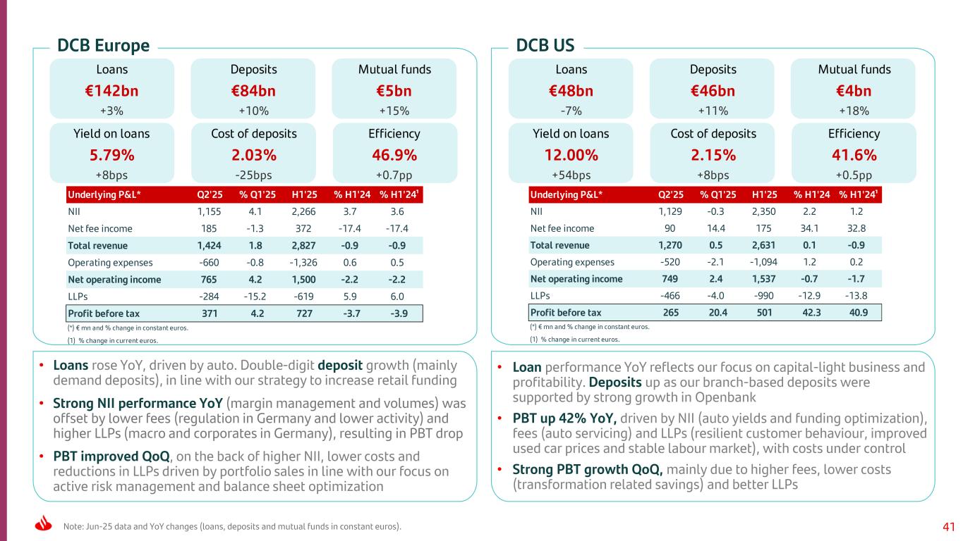 40 KEY DATA Digital Consumer Bank Note: Jun-25 data and YoY changes (new lending, loans and deposits in constant euros). P&L HIGHLIGHTS New lending €41bn -10% Loans €211bn +2% Efficiency 41.5% +0.9pp CoR 2.09% -8bps RoTE post-AT1 10.4% -1.5pp Deposits €130bn +10% Underlying P&L* Q2'25 % Q1'25 H1'25 % H1'24 % H1'24¹ NII 2,747 3.6 5,504 4.6 2.6 Net fee income 341 3.3 681 -5.7 -8.2 Total revenue 3,191 2.4 6,425 1.6 -0.4 Operating expenses -1,308 -0.1 -2,664 3.1 1.8 Net operating income 1,883 4.3 3,761 0.6 -1.9 LLPs -956 -10.4 -2,075 -2.6 -5.4 Attributable profit 551 16.5 1,042 -0.8 -2.5 (*) € mn and % change in constant euros. (1) % change in current euros. • Progressing in our priority to become the preferred choice of our partners and end customers, while being the most cost competitive player • Loans rose 2%, driven by auto lending in Europe and LatAm, in a European market that is picking up after a weak start to the year • Deposits up 10% across our footprint, in line with our deposit gathering strategy, supported by Openbank, and our focus on lowering funding costs and reducing NII volatility across the cycle • Profit affected by the impact of lower fiscal benefits following reduced electric vehicle demand. PBT up 11% YoY, by line: − NII rose across our footprint, mainly in Europe and LatAm, due to margin management and volumes, and the CrediScotia acquisition in Peru − Fees fell as strong growth in US (auto servicing) didn’t offset the impact from insurance regulation in Germany and auto registrations in Europe − Costs up 1% in real terms, supported by savings from our efficiency and transformation efforts, as we continued to invest in our platforms, Openbank and integrated CrediScotia in Peru − LLPs improved, driven by an excellent performance in auto in the US • Strong profit increase QoQ, boosted by NII (margin management), fees and lower LLPs, driven by good underlying trends in the US, portfolio sales in DCBE and DCB US and model updates in Brazil, with flat costs