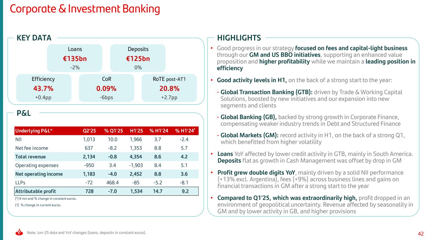 41Note: Jun-25 data and YoY changes (loans, deposits and mutual funds in constant euros). DCB Europe DCB US Underlying P&L* Q2'25 % Q1'25 H1'25 % H1'24 % H1'24¹ NII 1,129 -0.3 2,350 2.2 1.2 Net fee income 90 14.4 175 34.1 32.8 Total revenue 1,270 0.5 2,631 0.1 -0.9 Operating expenses -520 -2.1 -1,094 1.2 0.2 Net operating income 749 2.4 1,537 -0.7 -1.7 LLPs -466 -4.0 -990 -12.9 -13.8 Profit before tax 265 20.4 501 42.3 40.9 (*) € mn and % change in constant euros. (1) % change in current euros. Loans €142bn +3% Deposits €84bn +10% Mutual funds €5bn +15% Yield on loans 5.79% +8bps Cost of deposits 2.03% -25bps Efficiency 46.9% +0.7pp Loans €48bn -7% Deposits €46bn +11% Mutual funds €4bn +18% Yield on loans 12.00% +54bps Cost of deposits 2.15% +8bps Efficiency 41.6% +0.5pp Underlying P&L* Q2'25 % Q1'25 H1'25 % H1'24 % H1'24¹ NII 1,155 4.1 2,266 3.7 3.6 Net fee income 185 -1.3 372 -17.4 -17.4 Total revenue 1,424 1.8 2,827 -0.9 -0.9 Operating expenses -660 -0.8 -1,326 0.6 0.5 Net operating income 765 4.2 1,500 -2.2 -2.2 LLPs -284 -15.2 -619 5.9 6.0 Profit before tax 371 4.2 727 -3.7 -3.9 (*) € mn and % change in constant euros. (1) % change in current euros. • Loans rose YoY, driven by auto. Double-digit deposit growth (mainly demand deposits), in line with our strategy to increase retail funding • Strong NII performance YoY (margin management and volumes) was offset by lower fees (regulation in Germany and lower activity) and higher LLPs (macro and corporates in Germany), resulting in PBT drop • PBT improved QoQ, on the back of higher NII, lower costs and reductions in LLPs driven by portfolio sales in line with our focus on active risk management and balance sheet optimization • Loan performance YoY reflects our focus on capital-light business and profitability. Deposits up as our branch-based deposits were supported by strong growth in Openbank • PBT up 42% YoY, driven by NII (auto yields and funding optimization), fees (auto servicing) and LLPs (resilient customer behaviour, improved used car prices and stable labour market), with costs under control • Strong PBT growth QoQ, mainly due to higher fees, lower costs (transformation related savings) and better LLPs