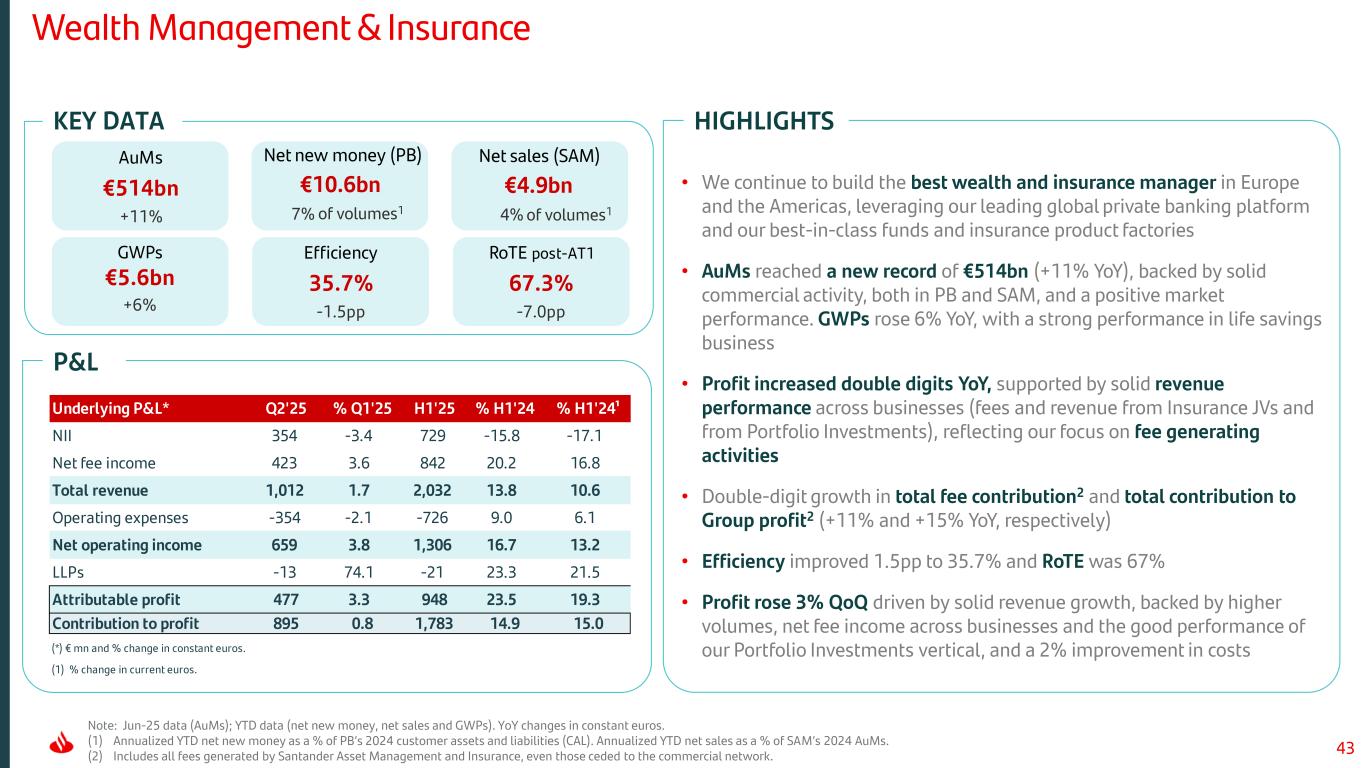 43 Wealth Management & Insurance P&L HIGHLIGHTS Note: Jun-25 data (AuMs); YTD data (net new money, net sales and GWPs). YoY changes in constant euros. (1) Annualized YTD net new money as a % of PB’s 2024 customer assets and liabilities (CAL). Annualized YTD net sales as a % of SAM’s 2024 AuMs. (2) Includes all fees generated by Santander Asset Management and Insurance, even those ceded to the commercial network. KEY DATA GWPs AuMs €514bn +11% of volumes1 of volumes1 €5.6bn +6% Efficiency 35.7% -1.5pp RoTE post-AT1 67.3% -7.0pp Underlying P&L* Q2'25 % Q1'25 H1'25 % H1'24 % H1'24¹ NII 354 -3.4 729 -15.8 -17.1 Net fee income 423 3.6 842 20.2 16.8 Total revenue 1,012 1.7 2,032 13.8 10.6 Operating expenses -354 -2.1 -726 9.0 6.1 Net operating income 659 3.8 1,306 16.7 13.2 LLPs -13 74.1 -21 23.3 21.5 Attributable profit 477 3.3 948 23.5 19.3 Contribution to profit 895 0.8 1,783 14.9 15.0 (*) € mn and % change in constant euros. (1) % change in current euros. • We continue to build the best wealth and insurance manager in Europe and the Americas, leveraging our leading global private banking platform and our best-in-class funds and insurance product factories • AuMs reached a new record of €514bn (+11% YoY), backed by solid commercial activity, both in PB and SAM, and a positive market performance. GWPs rose 6% YoY, with a strong performance in life savings business • Profit increased double digits YoY, supported by solid revenue performance across businesses (fees and revenue from Insurance JVs and from Portfolio Investments), reflecting our focus on fee generating activities • Double-digit growth in total fee contribution2 and total contribution to Group profit2 (+11% and +15% YoY, respectively) • Efficiency improved 1.5pp to 35.7% and RoTE was 67% • Profit rose 3% QoQ driven by solid revenue growth, backed by higher volumes, net fee income across businesses and the good performance of our Portfolio Investments vertical, and a 2% improvement in costs Net new money (PB) €10.6bn 7% Net sales (SAM) €4.9bn 4%