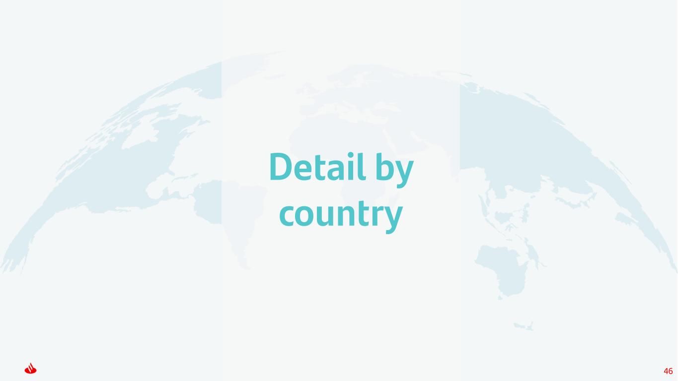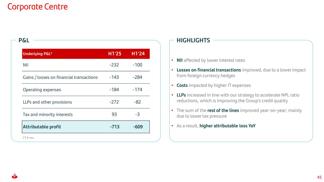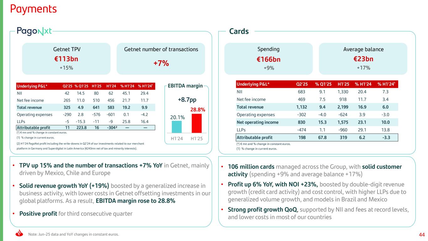 44 • 106 million cards managed across the Group, with solid customer activity (spending +9% and average balance +17%) • Profit up 6% YoY, with NOI +23%, boosted by double-digit revenue growth (credit card activity) and cost control, with higher LLPs due to generalized volume growth, and models in Brazil and Mexico • Strong profit growth QoQ, supported by NII and fees at record levels, and lower costs in most of our countries Payments Note: Jun-25 data and YoY changes in constant euros. 20.1% 28.8% H1'24 H1'25 Cards • TPV up 15% and the number of transactions +7% YoY in Getnet, mainly driven by Mexico, Chile and Europe • Solid revenue growth YoY (+19%) boosted by a generalized increase in business activity, with lower costs in Getnet offsetting investments in our global platforms. As a result, EBITDA margin rose to 28.8% • Positive profit for third consecutive quarter Spending Getnet TPV €113bn +15% Getnet number of transactions +7% Average balance €23bn +17% €166bn +9% Underlying P&L* Q2'25 % Q1'25 H1'25 % H1'24 % H1'24¹ NII 683 9.1 1,330 20.4 7.3 Net fee income 469 7.5 918 11.7 3.4 Total revenue 1,132 9.4 2,199 16.9 6.0 Operating expenses -302 -4.0 -624 3.9 -3.0 Net operating income 830 15.3 1,575 23.1 10.0 LLPs -474 1.1 -960 29.1 13.8 Attributable profit 198 67.8 319 6.2 -3.3 (*) € mn and % change in constant euros. (1) % change in current euros. EBITDA margin +8.7pp Underlying P&L* Q2'25 % Q1'25 H1'25 H1'24 % H1'24 % H1'24¹ NII 42 14.5 80 62 45.1 29.4 Net fee income 265 11.0 510 456 21.7 11.7 Total revenue 325 4.9 641 583 19.2 9.9 Operating expenses -290 2.8 -576 -601 0.1 -4.2 LLPs -5 -15.3 -11 -9 25.8 16.4 Attributable profit 11 223.8 16 -304 — — (*) € mn and % change in constant euros. (1) % change in current euros. (2) H1’24 PagoNxt profit including the write-downs in Q2’24 of our investments related to our merchant platform in Germany and Superdigital in Latin America (€243mn net of tax and minority interests). 2