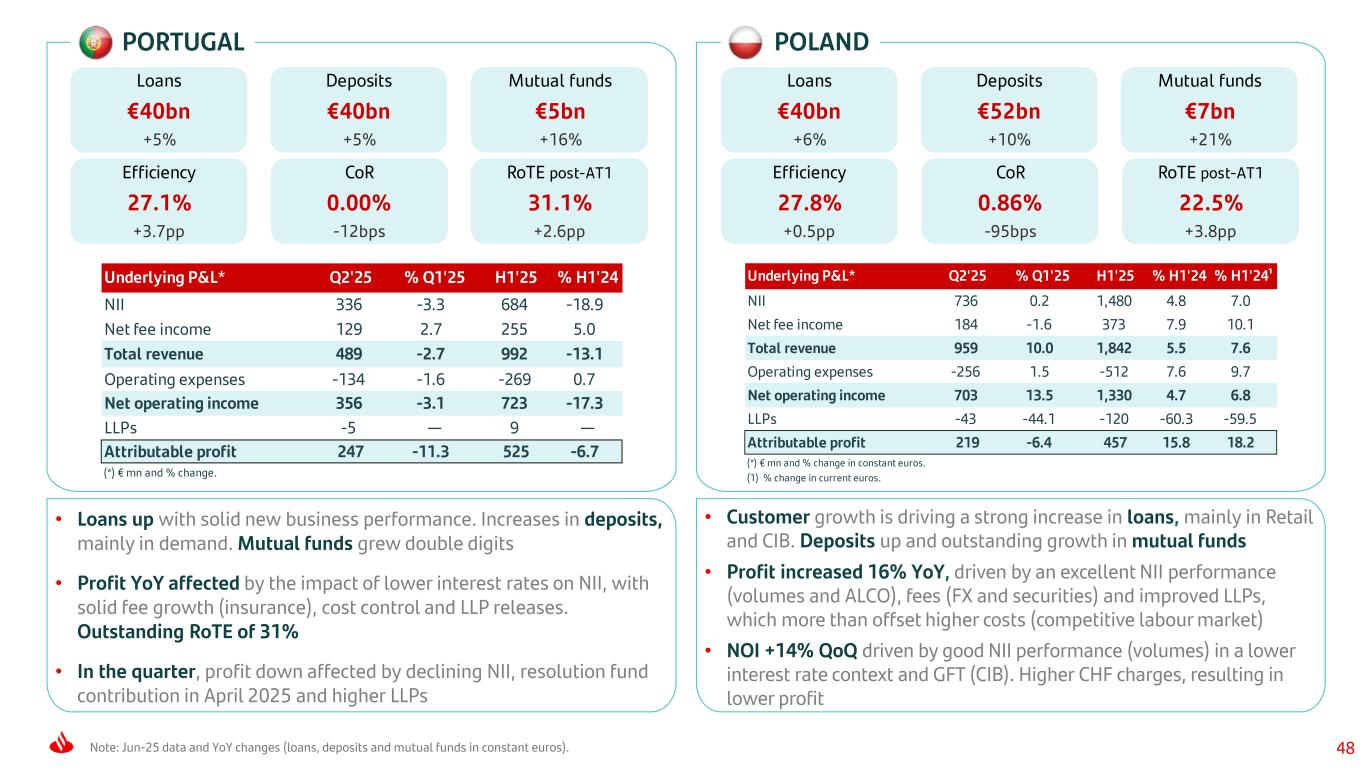 47 Note: Jun-25 data and YoY changes (loans, deposits and mutual funds in constant euros). SPAIN UK Underlying P&L* Q2'25 % Q1'25 H1'25 % H1'24 NII 1,806 1.5 3,585 -1.9 Net fee income 735 -4.1 1,503 1.3 Total revenue 3,036 -3.0 6,167 1.7 Operating expenses -1,051 0.2 -2,099 1.7 Net operating income 1,986 -4.6 4,067 1.7 LLPs -295 -2.6 -599 -9.0 Attributable profit 1,111 -3.1 2,258 28.6 (*) € mn and % change. Underlying P&L* Q2'25 % Q1'25 H1'25 % H1'24 % H1'24¹ NII 1,244 -2.6 2,543 5.2 6.8 Net fee income 84 3.8 166 15.1 16.8 Total revenue 1,302 -1.3 2,642 3.5 5.0 Operating expenses -707 -0.2 -1,427 -3.1 -1.7 Net operating income 594 -2.7 1,215 12.4 14.1 LLPs -60 16.3 -113 81.0 83.6 Attributable profit 276 -1.6 560 -12.3 -11.1 (*) € mn and % change in constant euros. (1) % change in current euros. Loans €232bn -1% Deposits €306bn +3% Mutual funds €99bn +15% Efficiency 34.0% -0.0pp CoR 0.47% -9bps RoTE post-AT1 25.3% +5.7pp Loans €229bn -2% Deposits €216bn -2% Mutual funds €8bn 0% Efficiency 54.0% -3.7pp CoR 0.05% -4bps RoTE post-AT1 8.9% -1.4pp • YoY loan performance reflects our focus on balance sheet optimization. Deposits dropped slightly in a context of lower interest rates • Net operating income +12% YoY, on the back of strong NII (margin management) and fees with lower costs (transformation), not reflected in profit due to LLP normalization and restructuring charges • Profit QoQ affected by the impact of lower interest rates on NII and the aforementioned LLP normalization, with flat costs • Loans reflect our focus on active risk management and balance sheet optimization and prepayments. Deposit growth driven by demand deposits. Mutual funds up double digits • Profit rose double digits YoY driven by revenue, solid underlying LLP trends and our active risk management that improves credit quality, with lower NII (interest rates) and costs growing below inflation • Strong positive performance in NII and LLPs QoQ. Profit affected by A2A transfer regulatory change impact on fees and lower GFT (CIB seasonality)