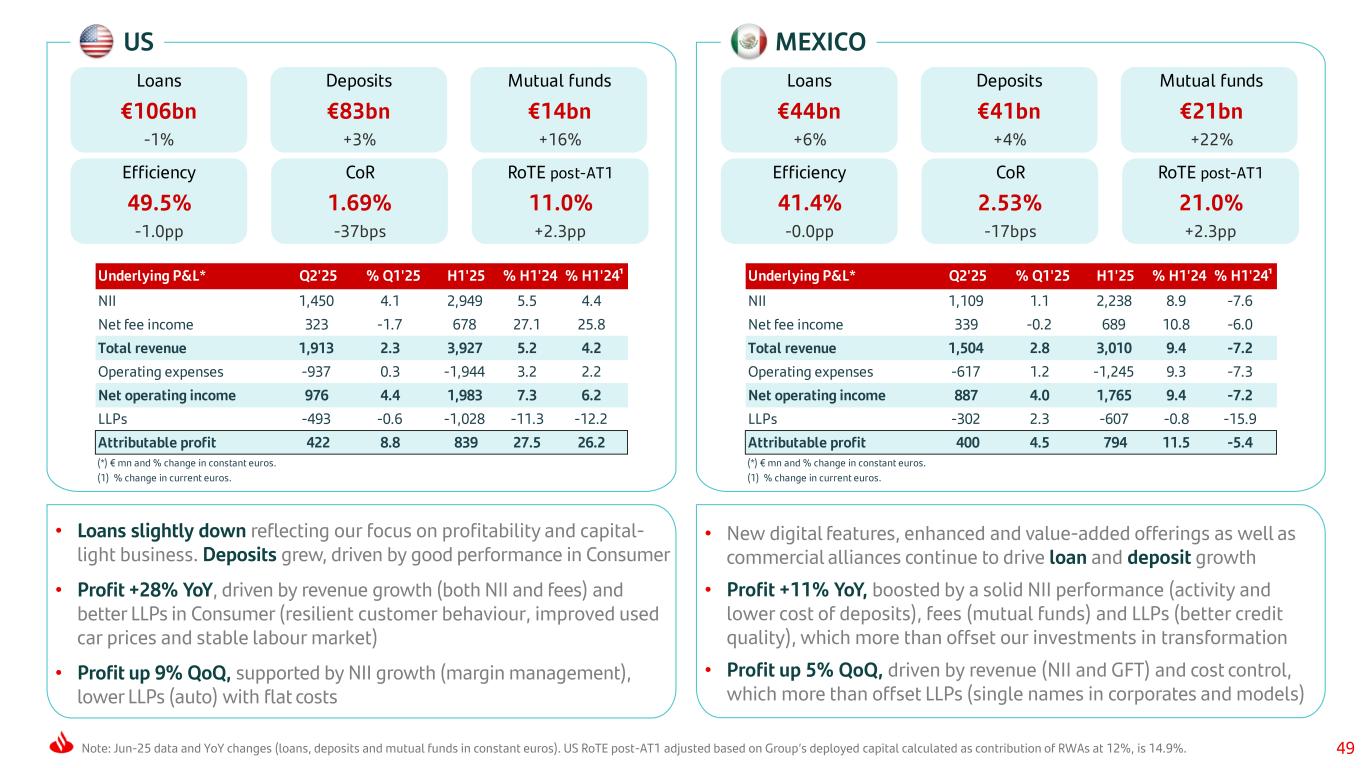 48Note: Jun-25 data and YoY changes (loans, deposits and mutual funds in constant euros). PORTUGAL POLAND Underlying P&L* Q2'25 % Q1'25 H1'25 % H1'24 NII 336 -3.3 684 -18.9 Net fee income 129 2.7 255 5.0 Total revenue 489 -2.7 992 -13.1 Operating expenses -134 -1.6 -269 0.7 Net operating income 356 -3.1 723 -17.3 LLPs -5 — 9 — Attributable profit 247 -11.3 525 -6.7 (*) € mn and % change. Underlying P&L* Q2'25 % Q1'25 H1'25 % H1'24 % H1'24¹ NII 736 0.2 1,480 4.8 7.0 Net fee income 184 -1.6 373 7.9 10.1 Total revenue 959 10.0 1,842 5.5 7.6 Operating expenses -256 1.5 -512 7.6 9.7 Net operating income 703 13.5 1,330 4.7 6.8 LLPs -43 -44.1 -120 -60.3 -59.5 Attributable profit 219 -6.4 457 15.8 18.2 (*) € mn and % change in constant euros. (1) % change in current euros. Loans €40bn +5% Deposits €40bn +5% Mutual funds €5bn +16% Efficiency 27.1% +3.7pp CoR 0.00% -12bps RoTE post-AT1 31.1% +2.6pp Loans €40bn +6% Deposits €52bn +10% Mutual funds €7bn +21% Efficiency 27.8% +0.5pp CoR 0.86% -95bps RoTE post-AT1 22.5% +3.8pp • Customer growth is driving a strong increase in loans, mainly in Retail and CIB. Deposits up and outstanding growth in mutual funds • Profit increased 16% YoY, driven by an excellent NII performance (volumes and ALCO), fees (FX and securities) and improved LLPs, which more than offset higher costs (competitive labour market) • NOI +14% QoQ driven by good NII performance (volumes) in a lower interest rate context and GFT (CIB). Higher CHF charges, resulting in lower profit • Loans up with solid new business performance. Increases in deposits, mainly in demand. Mutual funds grew double digits • Profit YoY affected by the impact of lower interest rates on NII, with solid fee growth (insurance), cost control and LLP releases. Outstanding RoTE of 31% • In the quarter, profit down affected by declining NII, resolution fund contribution in April 2025 and higher LLPs