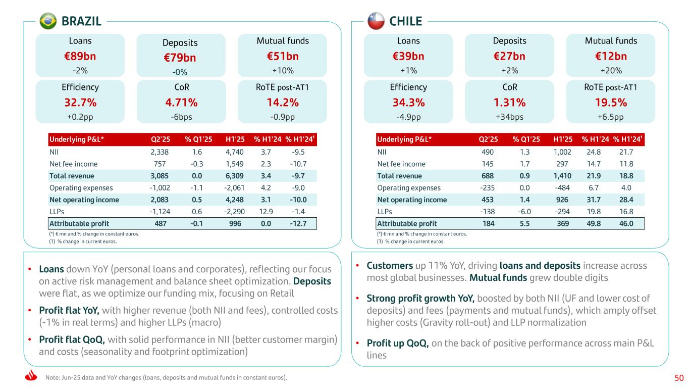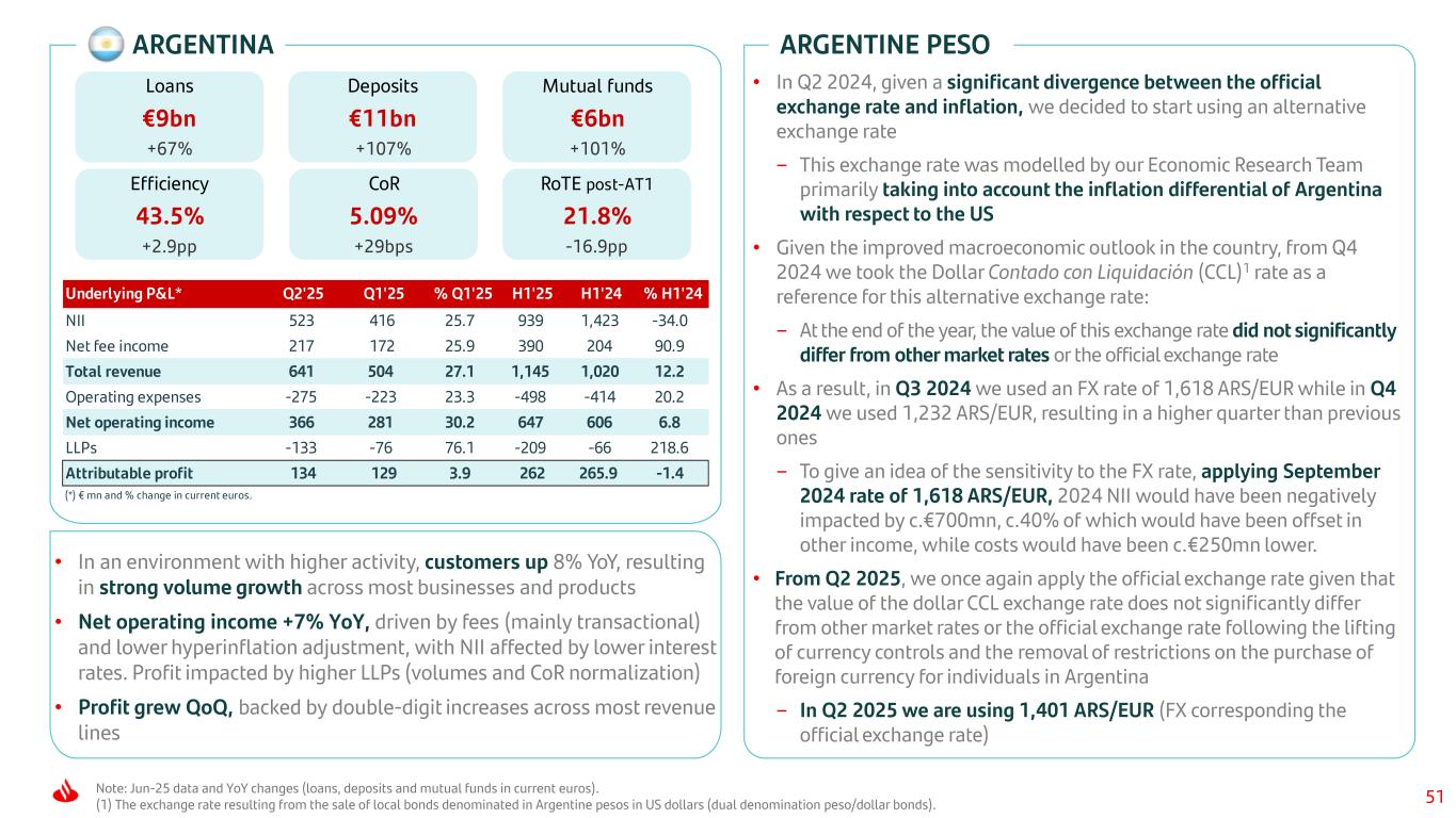50Note: Jun-25 data and YoY changes (loans, deposits and mutual funds in constant euros). BRAZIL Underlying P&L* Q2'25 % Q1'25 H1'25 % H1'24 % H1'24¹ NII 2,338 1.6 4,740 3.7 -9.5 Net fee income 757 -0.3 1,549 2.3 -10.7 Total revenue 3,085 0.0 6,309 3.4 -9.7 Operating expenses -1,002 -1.1 -2,061 4.2 -9.0 Net operating income 2,083 0.5 4,248 3.1 -10.0 LLPs -1,124 0.6 -2,290 12.9 -1.4 Attributable profit 487 -0.1 996 0.0 -12.7 (*) € mn and % change in constant euros. (1) % change in current euros. Loans €89bn -2% Mutual funds €51bn +10% Efficiency 32.7% +0.2pp CoR 4.71% -6bps RoTE post-AT1 14.2% -0.9pp • Loans down YoY (personal loans and corporates), reflecting our focus on active risk management and balance sheet optimization. Deposits were flat, as we optimize our funding mix, focusing on Retail • Profit flat YoY, with higher revenue (both NII and fees), controlled costs (-1% in real terms) and higher LLPs (macro) • Profit flat QoQ, with solid performance in NII (better customer margin) and costs (seasonality and footprint optimization) CHILE Underlying P&L* Q2'25 % Q1'25 H1'25 % H1'24 % H1'24¹ NII 490 1.3 1,002 24.8 21.7 Net fee income 145 1.7 297 14.7 11.8 Total revenue 688 0.9 1,410 21.9 18.8 Operating expenses -235 0.0 -484 6.7 4.0 Net operating income 453 1.4 926 31.7 28.4 LLPs -138 -6.0 -294 19.8 16.8 Attributable profit 184 5.5 369 49.8 46.0 (*) € mn and % change in constant euros. (1) % change in current euros. Loans €39bn +1% Deposits €27bn +2% Mutual funds €12bn +20% Efficiency 34.3% -4.9pp CoR 1.31% +34bps RoTE post-AT1 19.5% +6.5pp • Customers up 11% YoY, driving loans and deposits increase across most global businesses. Mutual funds grew double digits • Strong profit growth YoY, boosted by both NII (UF and lower cost of deposits) and fees (payments and mutual funds), which amply offset higher costs (Gravity roll-out) and LLP normalization • Profit up QoQ, on the back of positive performance across main P&L lines Deposits €79bn -0%
