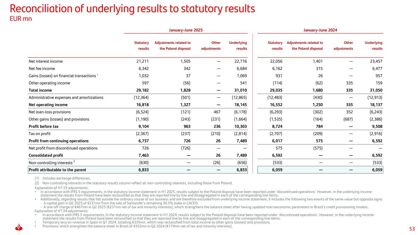 53 Reconciliation of underlying results to statutory results EUR mn (1) Includes exchange differences. (2) Non-controlling interests in the statutory results column reflect all non-controlling interests, including those from Poland. Explanation of H1’25 adjustments: • In accordance with IFRS 5 requirements, in the statutory income statement in H1 2025, results subject to the Poland disposal have been reported under 'discontinued operations’. However, in the underlying income statement the results from Poland have been reclassified so that they are reported line by line and disaggregated in each of the corresponding line items. • Additionally, regarding results that fall outside the ordinary course of our business and are therefore excluded from underlying income statement, it includes the following two events of the same value but opposite signs: - A capital gain in Q2 2025 of €231mn from the sale of Santander’s remaining 30.5% stake in CACEIS. - A one-off charge of €467mn in Q2 2025 (€231mn net of tax and minority interests), which strengthens the balance sheet after having updated macroeconomic parameters in Brazil’s credit provisioning models. Explanation of H1’24 adjustments: • In accordance with IFRS 5 requirements, in the statutory income statement in H1 2024, results subject to the Poland disposal have been reported under 'discontinued operations'. However, in the underlying income statement the results from Poland have been reclassified so that they are reported line by line and disaggregated in each of the corresponding line items. • Temporary levy on revenue in Spain in Q1 2024, totalling €335mn, which was reclassified from total income to other gains (losses) and provisions. • Provisions which strengthen the balance sheet in Brazil of €352mn in Q2 2024 (€174mn net of tax and minority interests). Statutory results Adjustments related to the Poland disposal Other adjustments Underlying results Statutory results Adjustments related to the Poland disposal Other adjustments Underlying results Net interest income 21,211 1,505 — 22,716 22,056 1,401 — 23,457 Net fee income 6,342 342 — 6,684 6,162 315 — 6,477 Gains (losses) on financial transactions 1 1,032 37 — 1,069 931 26 — 957 Other operating income 597 (56) — 541 (114) (62) 335 159 Total income 29,182 1,828 — 31,010 29,035 1,680 335 31,050 Administrative expenses and amortizations (12,364) (501) — (12,865) (12,483) (430) — (12,913) Net operating income 16,818 1,327 — 18,145 16,552 1,250 335 18,137 Net loan-loss provisions (6,524) (121) 467 (6,178) (6,293) (302) 352 (6,243) Other gains (losses) and provisions (1,190) (243) (231) (1,664) (1,535) (164) (687) (2,386) Profit before tax 9,104 963 236 10,303 8,724 784 — 9,508 Tax on profit (2,367) (237) (210) (2,814) (2,707) (209) — (2,916) Profit from continuing operations 6,737 726 26 7,489 6,017 575 — 6,592 Net profit from discontinued operations 726 (726) — — 575 (575) — — Consolidated profit 7,463 — 26 7,489 6,592 — — 6,592 Non-controlling interests 2 (630) — (26) (656) (533) — — (533) Profit attributable to the parent 6,833 — — 6,833 6,059 — — 6,059 January-June 2024January-June 2025