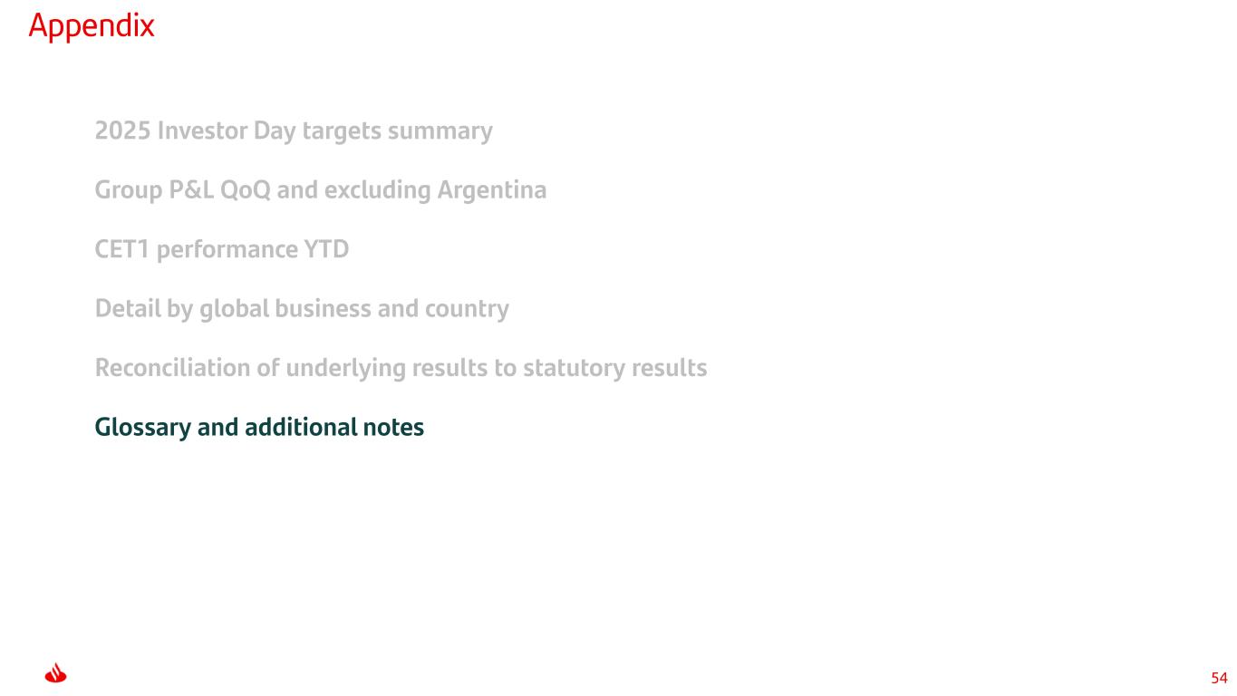 52 Appendix 2025 Investor Day targets summary Group P&L QoQ and excluding Argentina CET1 performance YTD Detail by global business and country Reconciliation of underlying results to statutory results Glossary and additional notes