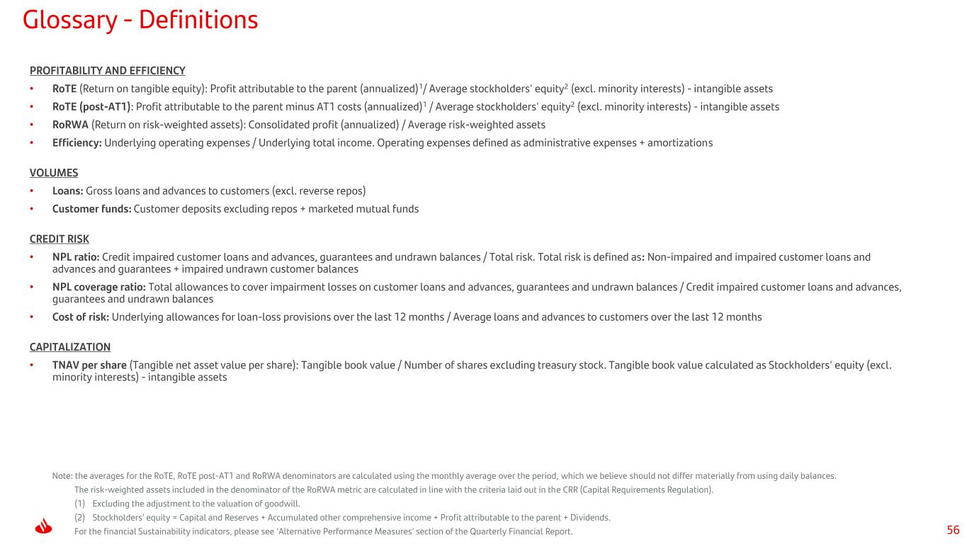 55 Glossary - Acronyms • A2A: account-to- account • AM: Asset management • AuMs: Assets under Management • bn: Billion • bps: Basis points • c.: Circa • CET1: Common equity tier 1 • CHF: Swiss franc • CF: Corporate Finance • CIB: Corporate & Investment Banking • CoE: Cost of equity • Consumer: Digital Consumer Bank • CoR: Cost of risk • DCB Europe: Digital Consumer Bank Europe • DCM: Debt Capital Markets • DPS: Dividend per share • EPS: Earnings per share • FX: Foreign Exchange • FY: Full year • GFT: Gains on financial transactions • ID: Investor Day • IFRS 5: International Financial Reporting Standard 5, on non-current assets held for sale and discontinued operations • IFRS 9: International Financial Reporting Standard 9, regarding financial instruments • k: Thousands • LLPs: Loan-loss provisions • mn: Million • NII: Net interest income • NIM: Net interest margin • n.m.: Not meaningful • NPL: Non-performing loans • OEM: Original equipment manufacturer • Payments: PagoNxt and Cards • PB: Private Banking • PBT: Profit before tax • P&L: Profit and loss • pp: Percentage points • Ps: Per share • QoQ: Quarter-on-Quarter • Repos: Repurchase agreements • Retail: Retail & Commercial Banking • RoE: Return on equity • RoRWA: Return on risk-weighted assets • RoTE: Return on tangible equity • RWA: Risk-weighted assets • SAM: Santander Asset Management • SBB: share buybacks • SME: Small and Medium Enterprises • US BBO: US Banking Build-Out • TNAV: Tangible net asset value • TPV: Total Payments Volume • YoY: Year-on-Year • YTD: Year to date • Wealth: Wealth Management & Insurance • #: Number