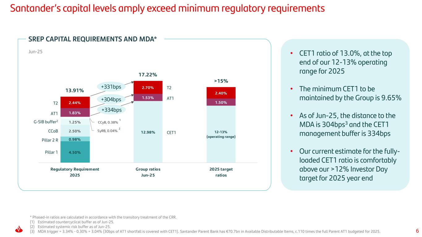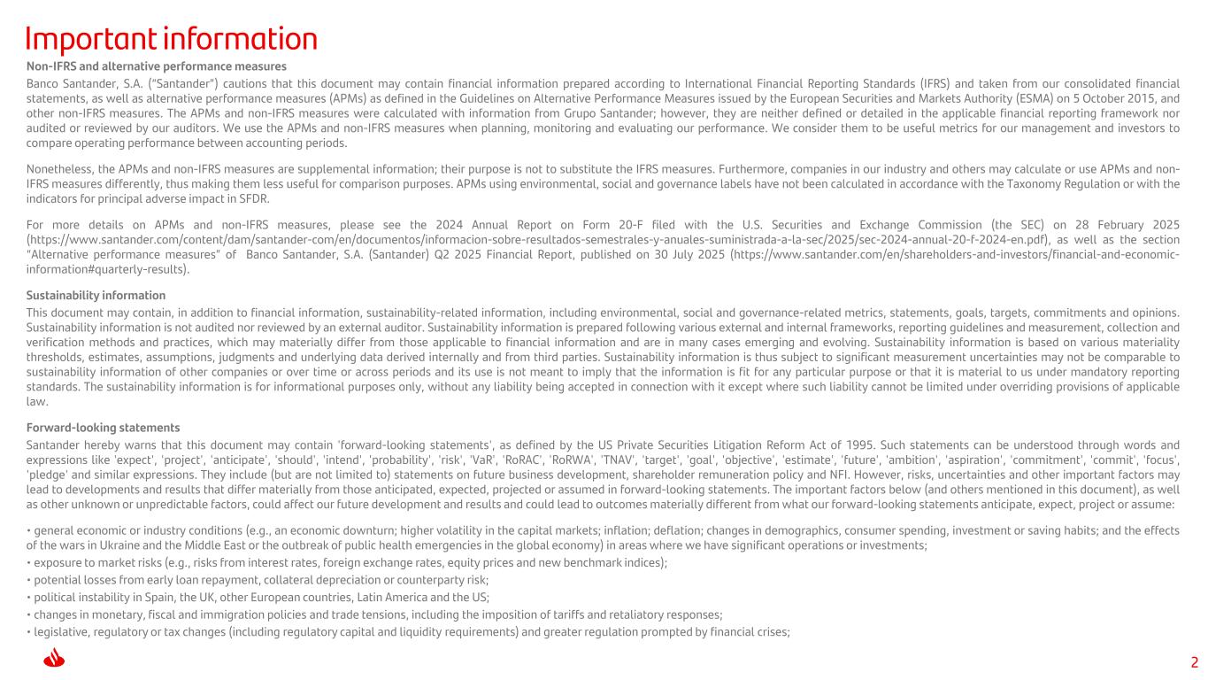 3 Important information • acquisitions, integrations, divestitures and challenges arising from deviating management’s resources and attention from other strategic opportunities and operational matters; • climate-related conditions, regulations, targets and weather events; • uncertainty over the scope of actions that may be required by us, governments and other to achieve goals relating to climate, environmental and social matters, as well as the evolving nature of underlying science and potential conflicts and inconsistencies among governmental standards and regulations. Important factors affecting sustainability information may materially differ from those applicable to financial information. Sustainability information is based on various materiality thresholds, estimates, assumptions, judgments and underlying data derived internally and from third parties. Sustainability information is thus subject to significant measurement uncertainties, may not be comparable to sustainability information of other companies or over time or across periods and its inclusion is not meant to imply that the information is fit for any particular purpose or that it is material to us under mandatory reporting standards. The sustainability information is for informational purposes only, without any liability being accepted in connection with it except where such liability cannot be limited under overriding provisions of applicable law; • our own decisions and actions, including those affecting or changing our practices, operations, priorities, strategies, policies or procedures; • changes affecting our access to liquidity and funding on acceptable terms, especially due to credit spread shifts or credit rating downgrade for the entire group or core subsidiaries; • our exposure to operational losses; and • potential losses associated with cyberattacks, data breaches, data losses and other security incidents Forward looking statements are based on current expectations and future estimates about Santander’s and third-parties’ operations and businesses and address matters that are uncertain to varying degrees, including, but not limited to developing standards that may change in the future; plans, projections, expectations, targets, objectives, strategies and goals relating to environmental, social, safety and governance performance, including expectations regarding future execution of Santander’s and third parties’ energy and climate strategies, and the underlying assumptions and estimated impacts on Santander’s and third-parties’ businesses related thereto; Santander’s and third-parties’ approach, plans and expectations in relation to carbon use and targeted reductions of emissions; changes in operations or investments under existing or future environmental laws and regulations; and changes in government regulations and regulatory requirements, including those related to climate-related initiatives. Forward-looking statements are aspirational, should be regarded as indicative, preliminary and for illustrative purposes only, speak only as of the date of this document and are informed by the knowledge, information and views available on such date and are subject to change without notice. Banco Santander is not required to update or revise any forward-looking statements, regardless of new information, future events or otherwise, except as required by applicable law. Past performance does not indicate future outcomes Statements about historical performance or growth rates must not be construed as suggesting that future performance, share price or earnings (including earnings per share) will necessarily be the same or higher than in a previous period. Nothing mentioned in this document should be taken as a profit and loss forecast. Not a securities offer This document and the information it contains, does not constitute an offer to sell nor the solicitation of an offer to buy any securities. Third Party Information In particular, regarding the data provided by third parties, neither Santander, nor any of its directors, managers or employees, either explicitly or implicitly, guarantees that these contents are exact, accurate, comprehensive or complete, nor are they obliged to keep them updated, nor to correct them in the case that any deficiency, error or omission were to be detected. Moreover, in reproducing these contents in by any means, Santander may introduce any changes it deems suitable, and may omit, partially or completely, any of the elements of this document, and in case of any deviation, Santander assumes no liability for any discrepancy. Sale of 49% stake in Santander Bank Polska to Erste Group All figures, including P&L, loans and advances to customers, customer funds and other metrics are presented on an underlying basis and include Santander Bank Polska, in line with previously published quarterly information, i.e. maintaining the same perimeter that existed at the time of the announcement of the sale of 49% stake in Santander Bank Polska to Erste Group (https://www.santander.com/content/dam/santander- com/en/documentos/informacion-privilegiada/2025/05/hr-2025-05-05-santander-announces-the-sale-of-49-per-cent-of-santander-polska-to-erste-group-bank-and-agrees-strategic-cooperation-across-cib-and- payments-en.pdf). For further information, see the 'Significant events in the period’ and 'Alternative performance measures' sections of Banco Santander, S.A. (Santander) Q2 2025 Financial Report, published on 30 July 2025 (https://www.santander.com/en/shareholders-and-investors/financial-and-economic-information#quarterly-results).