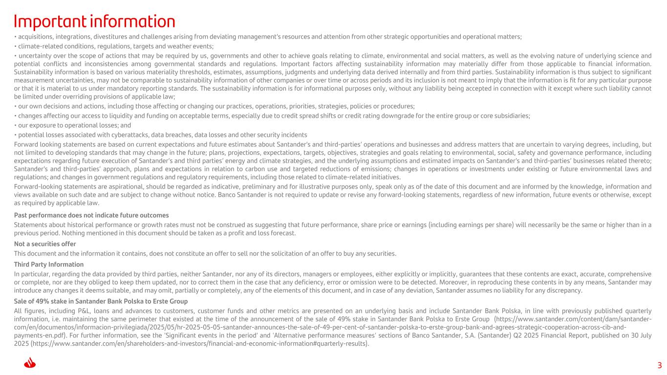 2 Important information Non-IFRS and alternative performance measures Banco Santander, S.A. (“Santander”) cautions that this document may contain financial information prepared according to International Financial Reporting Standards (IFRS) and taken from our consolidated financial statements, as well as alternative performance measures (APMs) as defined in the Guidelines on Alternative Performance Measures issued by the European Securities and Markets Authority (ESMA) on 5 October 2015, and other non-IFRS measures. The APMs and non-IFRS measures were calculated with information from Grupo Santander; however, they are neither defined or detailed in the applicable financial reporting framework nor audited or reviewed by our auditors. We use the APMs and non-IFRS measures when planning, monitoring and evaluating our performance. We consider them to be useful metrics for our management and investors to compare operating performance between accounting periods. Nonetheless, the APMs and non-IFRS measures are supplemental information; their purpose is not to substitute the IFRS measures. Furthermore, companies in our industry and others may calculate or use APMs and non- IFRS measures differently, thus making them less useful for comparison purposes. APMs using environmental, social and governance labels have not been calculated in accordance with the Taxonomy Regulation or with the indicators for principal adverse impact in SFDR. For more details on APMs and non-IFRS measures, please see the 2024 Annual Report on Form 20-F filed with the U.S. Securities and Exchange Commission (the SEC) on 28 February 2025 (https://www.santander.com/content/dam/santander-com/en/documentos/informacion-sobre-resultados-semestrales-y-anuales-suministrada-a-la-sec/2025/sec-2024-annual-20-f-2024-en.pdf), as well as the section “Alternative performance measures” of Banco Santander, S.A. (Santander) Q2 2025 Financial Report, published on 30 July 2025 (https://www.santander.com/en/shareholders-and-investors/financial-and-economic- information#quarterly-results). Sustainability information This document may contain, in addition to financial information, sustainability-related information, including environmental, social and governance-related metrics, statements, goals, targets, commitments and opinions. Sustainability information is not audited nor reviewed by an external auditor. Sustainability information is prepared following various external and internal frameworks, reporting guidelines and measurement, collection and verification methods and practices, which may materially differ from those applicable to financial information and are in many cases emerging and evolving. Sustainability information is based on various materiality thresholds, estimates, assumptions, judgments and underlying data derived internally and from third parties. Sustainability information is thus subject to significant measurement uncertainties may not be comparable to sustainability information of other companies or over time or across periods and its use is not meant to imply that the information is fit for any particular purpose or that it is material to us under mandatory reporting standards. The sustainability information is for informational purposes only, without any liability being accepted in connection with it except where such liability cannot be limited under overriding provisions of applicable law. Forward-looking statements Santander hereby warns that this document may contain 'forward-looking statements', as defined by the US Private Securities Litigation Reform Act of 1995. Such statements can be understood through words and expressions like 'expect', 'project', 'anticipate', 'should', 'intend', 'probability', 'risk', 'VaR', 'RoRAC', 'RoRWA', 'TNAV', 'target', 'goal', 'objective', 'estimate', 'future', 'ambition', 'aspiration', 'commitment', 'commit', 'focus', 'pledge' and similar expressions. They include (but are not limited to) statements on future business development, shareholder remuneration policy and NFI. However, risks, uncertainties and other important factors may lead to developments and results that differ materially from those anticipated, expected, projected or assumed in forward-looking statements. The important factors below (and others mentioned in this document), as well as other unknown or unpredictable factors, could affect our future development and results and could lead to outcomes materially different from what our forward-looking statements anticipate, expect, project or assume: • general economic or industry conditions (e.g., an economic downturn; higher volatility in the capital markets; inflation; deflation; changes in demographics, consumer spending, investment or saving habits; and the effects of the wars in Ukraine and the Middle East or the outbreak of public health emergencies in the global economy) in areas where we have significant operations or investments; • exposure to market risks (e.g., risks from interest rates, foreign exchange rates, equity prices and new benchmark indices); • potential losses from early loan repayment, collateral depreciation or counterparty risk; • political instability in Spain, the UK, other European countries, Latin America and the US; • changes in monetary, fiscal and immigration policies and trade tensions, including the imposition of tariffs and retaliatory responses; • legislative, regulatory or tax changes (including regulatory capital and liquidity requirements) and greater regulation prompted by financial crises;