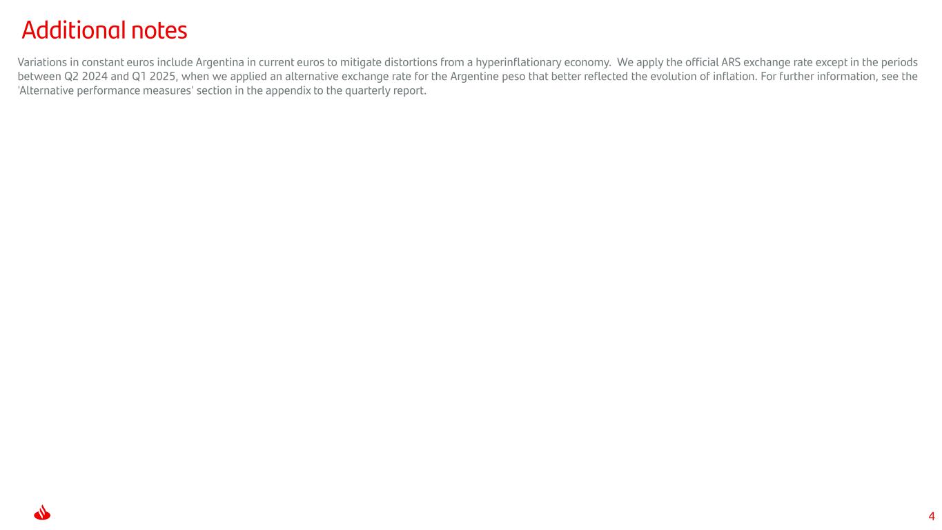 4 Variations in constant euros include Argentina in current euros to mitigate distortions from a hyperinflationary economy. We apply the official ARS exchange rate except in the periods between Q2 2024 and Q1 2025, when we applied an alternative exchange rate for the Argentine peso that better reflected the evolution of inflation. For further information, see the 'Alternative performance measures' section in the appendix to the quarterly report. Additional notes