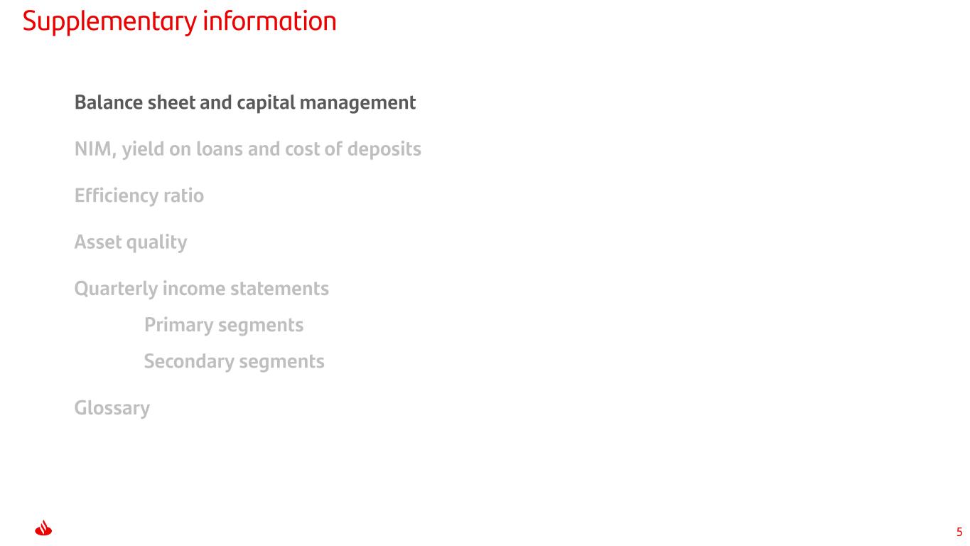 5 Supplementary information Balance sheet and capital management NIM, yield on loans and cost of deposits Efficiency ratio Asset quality Quarterly income statements Primary segments Secondary segments Glossary