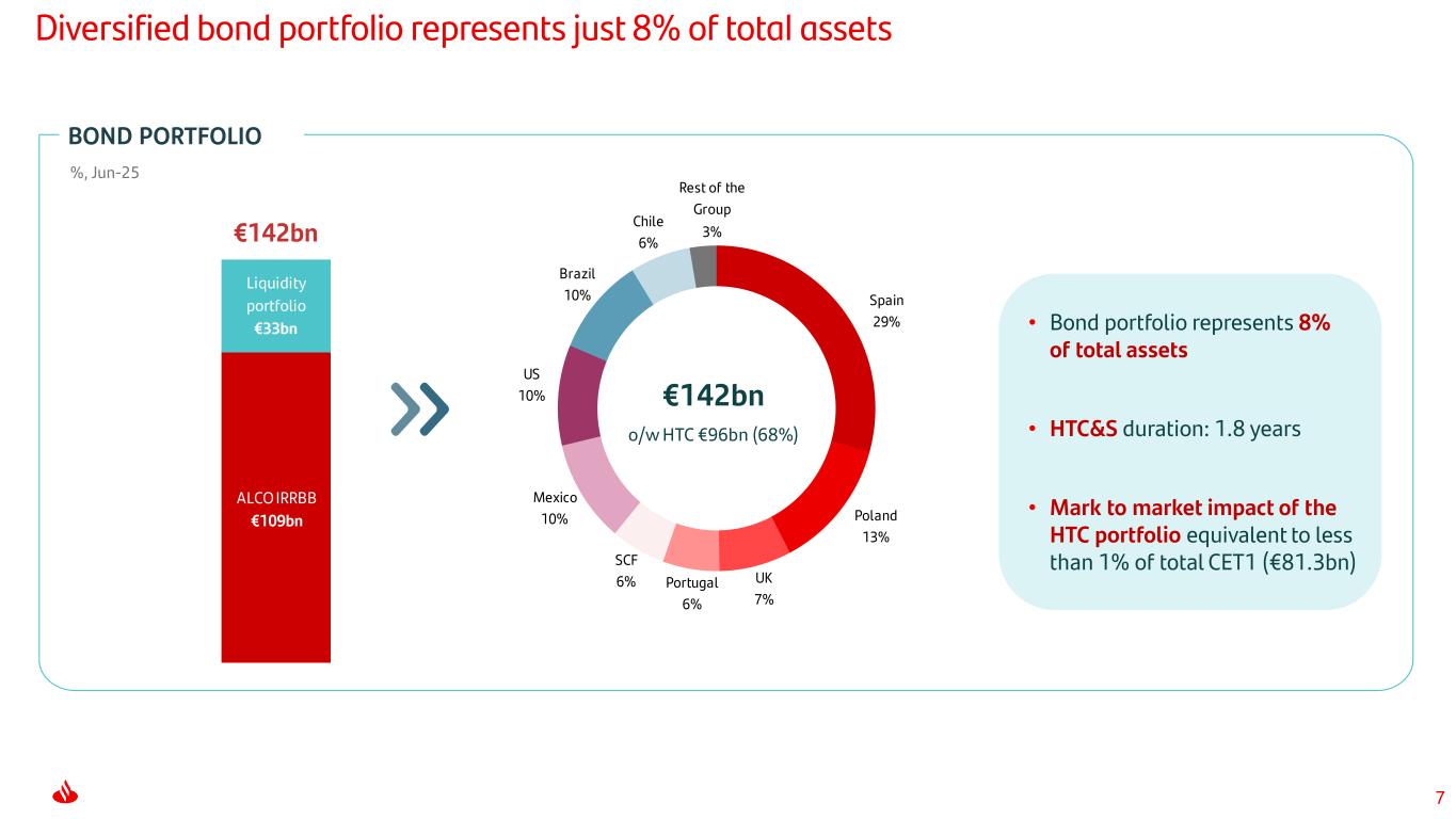 6 Santander’s capital levels amply exceed minimum regulatory requirements * Phased-in ratios are calculated in accordance with the transitory treatment of the CRR. (1) Estimated countercyclical buffer as of Jun-25. (2) Estimated systemic risk buffer as of Jun-25. (3) MDA trigger = 3.34% - 0.30% = 3.04% (30bps of AT1 shortfall is covered with CET1). Santander Parent Bank has €70.7bn in Available Distributable Items, c.110 times the full Parent AT1 budgeted for 2025. 4.50% 12.98% 12-13% (operating range) 0.98% 2.50% 1.25% SyRB, 0.04% CCyB, 0.38% 1.83% 1.53% 1.50%2.44% 2.70% 2.40% 13.91% 17.22% >15% Regulatory Requirement 2025 Group ratios Jun-25 2025 target ratios CET1CCoB Pillar 1 AT1 G-SIB buffer2 T2 T2 AT1 Pillar 2 R Jun-25 +331bps +304bps 1 2 +334bps SREP CAPITAL REQUIREMENTS AND MDA* • CET1 ratio of 13.0%, at the top end of our 12-13% operating range for 2025 • The minimum CET1 to be maintained by the Group is 9.65% • As of Jun-25, the distance to the MDA is 304bps3 and the CET1 management buffer is 334bps • Our current estimate for the fully- loaded CET1 ratio is comfortably above our >12% Investor Day target for 2025 year end