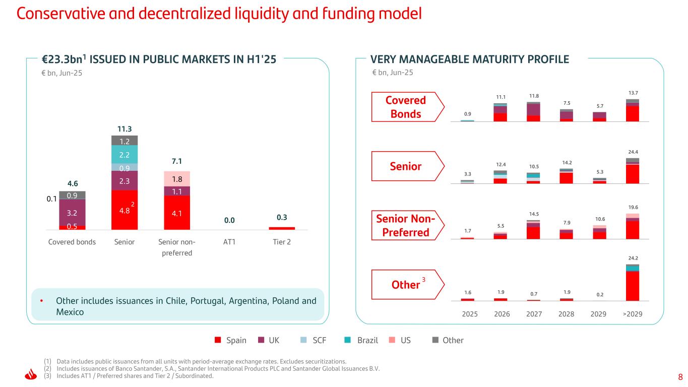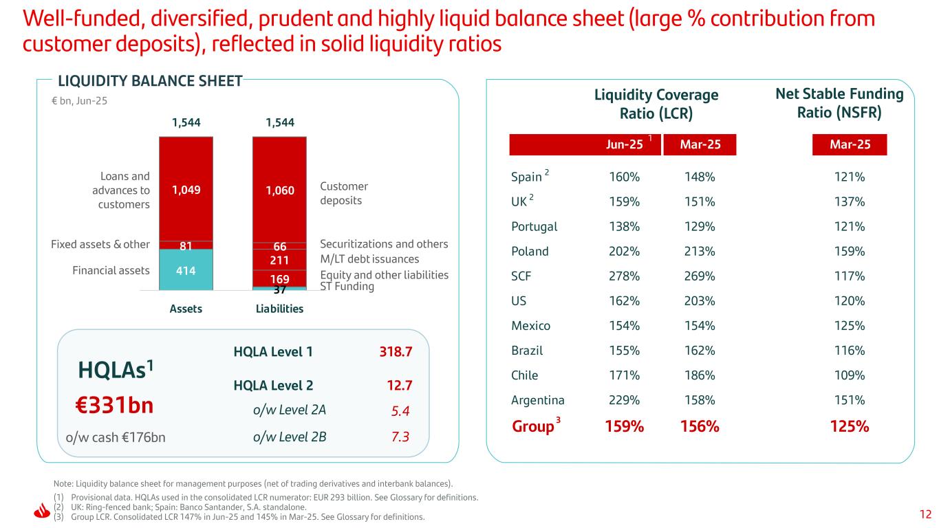 12 € bn, Jun-25 ST Funding Securitizations and others Loans and advances to customers Fixed assets & other Customer deposits M/LT debt issuances Equity and other liabilitiesFinancial assets 414 37 81 169 1,049 211 66 1,060 1,544 1,544 Assets Liabilities HQLAs1 LIQUIDITY BALANCE SHEET €331bn o/w cash €176bn HQLA Level 1 318.7 HQLA Level 2 12.7 o/w Level 2A 5.4 o/w Level 2B 7.3 Note: Liquidity balance sheet for management purposes (net of trading derivatives and interbank balances). (1) Provisional data. HQLAs used in the consolidated LCR numerator: EUR 293 billion. See Glossary for definitions. (2) UK: Ring-fenced bank; Spain: Banco Santander, S.A. standalone. (3) Group LCR. Consolidated LCR 147% in Jun-25 and 145% in Mar-25. See Glossary for definitions. Net Stable Funding Ratio (NSFR) Jun-25 Mar-25 Mar-25 Spain 2 160% 148% 121% UK 2 159% 151% 137% Portugal 138% 129% 121% Poland 202% 213% 159% SCF 278% 269% 117% US 162% 203% 120% Mexico 154% 154% 125% Brazil 155% 162% 116% Chile 171% 186% 109% Argentina 229% 158% 151% Group 159% 156% 125% 1 Liquidity Coverage Ratio (LCR) 3 Well-funded, diversified, prudent and highly liquid balance sheet (large % contribution from customer deposits), reflected in solid liquidity ratios