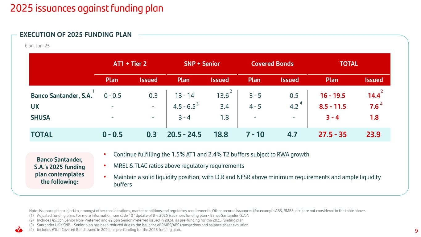 8 Conservative and decentralized liquidity and funding model € bn, Jun-25 Covered Bonds Senior Non- Preferred Senior Other 2025 2026 2027 2028 >2029 0.9 11.1 11.8 7.5 5.7 13.7 1.7 5.5 14.5 7.9 10.6 19.6 3.3 12.4 10.5 14.2 5.3 24.4 1.6 1.9 0.7 1.9 0.2 24.2 2029 Spain UK SCF Brazil US Other 3 €23.3bn1 ISSUED IN PUBLIC MARKETS IN H1'25 VERY MANAGEABLE MATURITY PROFILE € bn, Jun-25 • Other includes issuances in Chile, Portugal, Argentina, Poland and Mexico 0.5 4.8 4.13.2 2.3 1.1 0.9 1.8 0.1 2.2 0.9 1.2 4.6 11.3 7.1 0.0 0.3 Covered bonds Senior Senior non- preferred AT1 Tier 2 2 (1) Data includes public issuances from all units with period-average exchange rates. Excludes securitizations. (2) Includes issuances of Banco Santander, S.A., Santander International Products PLC and Santander Global Issuances B.V. (3) Includes AT1 / Preferred shares and Tier 2 / Subordinated.