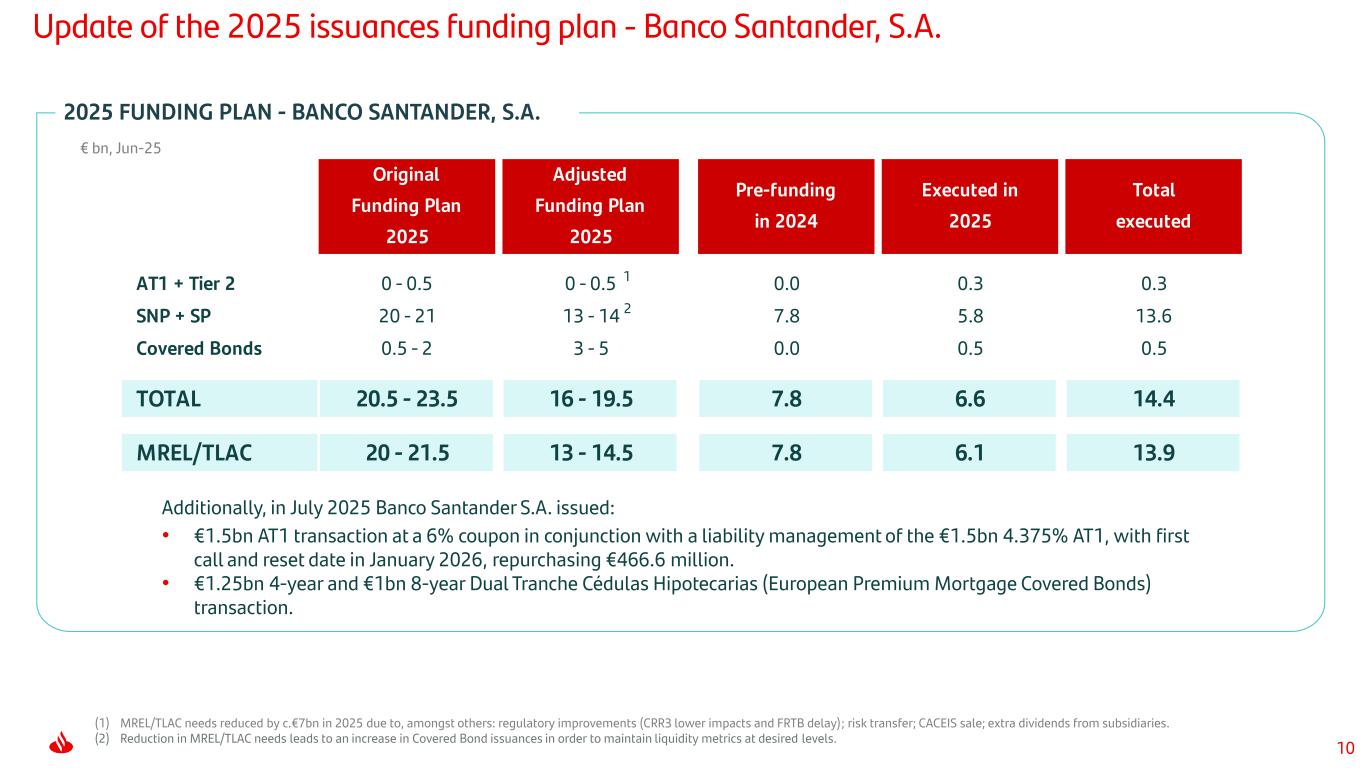 9 EXECUTION OF 2025 FUNDING PLAN • Continue fulfilling the 1.5% AT1 and 2.4% T2 buffers subject to RWA growth • MREL & TLAC ratios above regulatory requirements • Maintain a solid liquidity position, with LCR and NFSR above minimum requirements and ample liquidity buffers Banco Santander, S.A.’s 2025 funding plan contemplates the following: Note: Issuance plan subject to, amongst other considerations, market conditions and regulatory requirements. Other secured issuances (for example ABS, RMBS, etc.) are not considered in the table above. (1) Adjusted funding plan. For more information, see slide 10 ”Update of the 2025 issuances funding plan - Banco Santander, S.A.”. (2) Includes €5.3bn Senior Non-Preferred and €2.5bn Senior Preferred issued in 2024, as pre-funding for the 2025 funding plan. (3) Santander UK’s SNP + Senior plan has been reduced due to the issuance of RMBS/ABS transactions and balance sheet evolution. (4) Includes €1bn Covered Bond issued in 2024, as pre-funding for the 2025 funding plan. Plan Issued Plan Issued Plan Issued Plan Issued Banco Santander, S.A. 0 - 0.5 0.3 13 - 14 13.6 3 - 5 0.5 16 - 19.5 14.4 UK - - 4.5 - 6.5 3.4 4 - 5 4.2 8.5 - 11.5 7.6 SHUSA - - 3 - 4 1.8 - - 3 - 4 1.8 TOTAL 0 - 0.5 0.3 20.5 - 24.5 18.8 7 - 10 4.7 27.5 - 35 23.9 AT1 + Tier 2 SNP + Senior Covered Bonds TOTAL 2 4 2 43 1 € bn, Jun-25 2025 issuances against funding plan