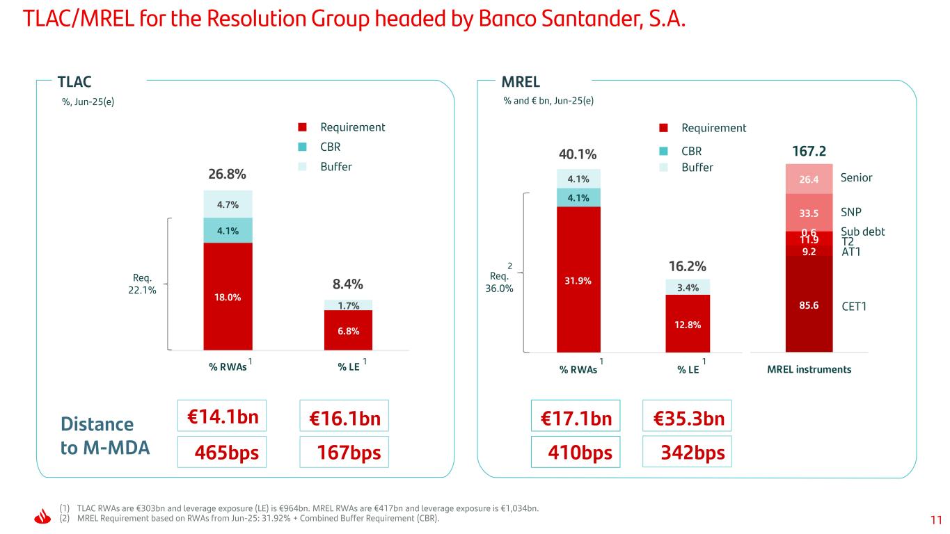 10 EXECUTION OF 2025 FUNDING PLAN2025 FUNDING PLAN - BANCO SANTANDER, S.A. (1) MREL/TLAC needs reduced by c.€7bn in 2025 due to, amongst others: regulatory improvements (CRR3 lower impacts and FRTB delay); risk transfer; CACEIS sale; extra dividends from subsidiaries. (2) Reduction in MREL/TLAC needs leads to an increase in Covered Bond issuances in order to maintain liquidity metrics at desired levels. € bn, Jun-25 Original Funding Plan Adjusted Funding Plan 2025 2025 AT1 + Tier 2 0 - 0.5 0 - 0.5 0.0 0.3 0.3 SNP + SP 20 - 21 13 - 14 7.8 5.8 13.6 Covered Bonds 0.5 - 2 3 - 5 0.0 0.5 0.5 TOTAL 20.5 - 23.5 16 - 19.5 7.8 6.6 14.4 MREL/TLAC 20 - 21.5 13 - 14.5 7.8 6.1 13.9 Executed in 2025 Total executed Pre-funding in 2024 1 Additionally, in July 2025 Banco Santander S.A. issued: • €1.5bn AT1 transaction at a 6% coupon in conjunction with a liability management of the €1.5bn 4.375% AT1, with first call and reset date in January 2026, repurchasing €466.6 million. • €1.25bn 4-year and €1bn 8-year Dual Tranche Cédulas Hipotecarias (European Premium Mortgage Covered Bonds) transaction. 2 Update of the 2025 issuances funding plan - Banco Santander, S.A.