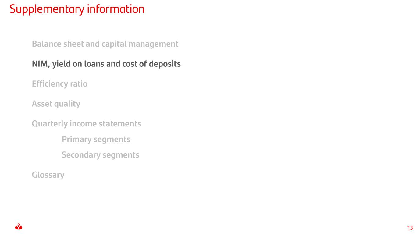 13 Supplementary information Balance sheet and capital management NIM, yield on loans and cost of deposits Efficiency ratio Asset quality Quarterly income statements Primary segments Secondary segments Glossary