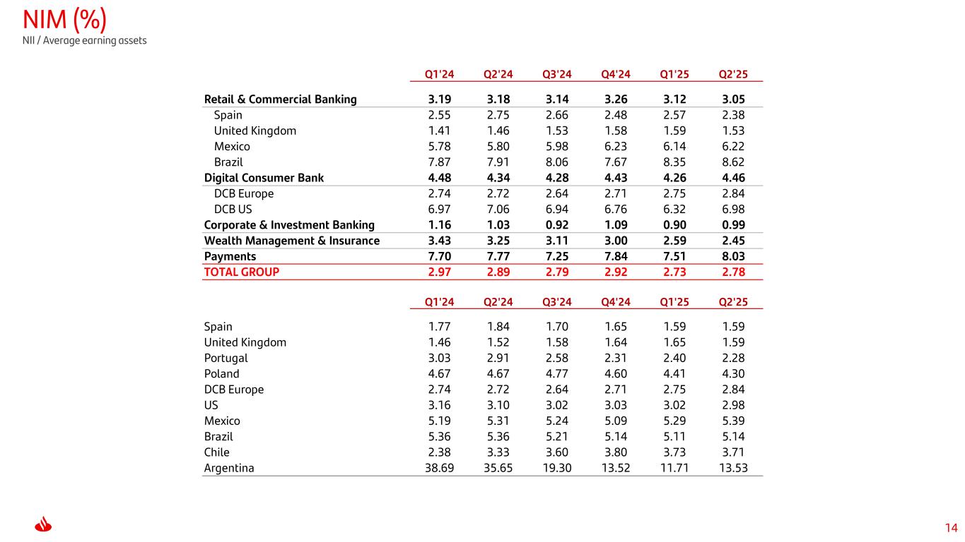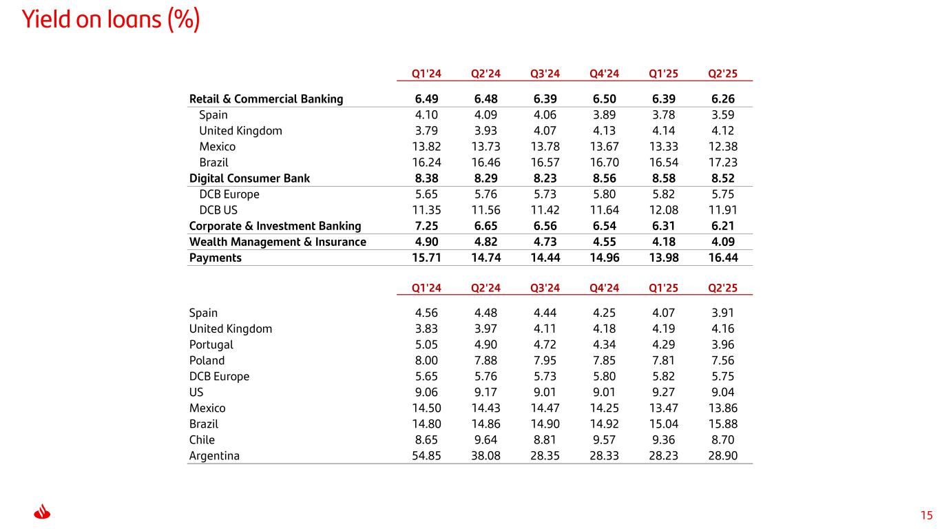 14 NIM (%) NII / Average earning assets Q1'24 Q2'24 Q3'24 Q4'24 Q1'25 Q2'25 Retail & Commercial Banking 3.19 3.18 3.14 3.26 3.12 3.05 Spain 2.55 2.75 2.66 2.48 2.57 2.38 United Kingdom 1.41 1.46 1.53 1.58 1.59 1.53 Mexico 5.78 5.80 5.98 6.23 6.14 6.22 Brazil 7.87 7.91 8.06 7.67 8.35 8.62 Digital Consumer Bank 4.48 4.34 4.28 4.43 4.26 4.46 DCB Europe 2.74 2.72 2.64 2.71 2.75 2.84 DCB US 6.97 7.06 6.94 6.76 6.32 6.98 Corporate & Investment Banking 1.16 1.03 0.92 1.09 0.90 0.99 Wealth Management & Insurance 3.43 3.25 3.11 3.00 2.59 2.45 Payments 7.70 7.77 7.25 7.84 7.51 8.03 TOTAL GROUP 2.97 2.89 2.79 2.92 2.73 2.78 Q1'24 Q2'24 Q3'24 Q4'24 Q1'25 Q2'25 Spain 1.77 1.84 1.70 1.65 1.59 1.59 United Kingdom 1.46 1.52 1.58 1.64 1.65 1.59 Portugal 3.03 2.91 2.58 2.31 2.40 2.28 Poland 4.67 4.67 4.77 4.60 4.41 4.30 DCB Europe 2.74 2.72 2.64 2.71 2.75 2.84 US 3.16 3.10 3.02 3.03 3.02 2.98 Mexico 5.19 5.31 5.24 5.09 5.29 5.39 Brazil 5.36 5.36 5.21 5.14 5.11 5.14 Chile 2.38 3.33 3.60 3.80 3.73 3.71 Argentina 38.69 35.65 19.30 13.52 11.71 13.53