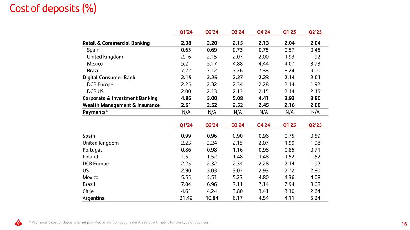 15 Yield on loans (%) Q1'24 Q2'24 Q3'24 Q4'24 Q1'25 Q2'25 Retail & Commercial Banking 6.49 6.48 6.39 6.50 6.39 6.26 Spain 4.10 4.09 4.06 3.89 3.78 3.59 United Kingdom 3.79 3.93 4.07 4.13 4.14 4.12 Mexico 13.82 13.73 13.78 13.67 13.33 12.38 Brazil 16.24 16.46 16.57 16.70 16.54 17.23 Digital Consumer Bank 8.38 8.29 8.23 8.56 8.58 8.52 DCB Europe 5.65 5.76 5.73 5.80 5.82 5.75 DCB US 11.35 11.56 11.42 11.64 12.08 11.91 Corporate & Investment Banking 7.25 6.65 6.56 6.54 6.31 6.21 Wealth Management & Insurance 4.90 4.82 4.73 4.55 4.18 4.09 Payments 15.71 14.74 14.44 14.96 13.98 16.44 Q1'24 Q2'24 Q3'24 Q4'24 Q1'25 Q2'25 Spain 4.56 4.48 4.44 4.25 4.07 3.91 United Kingdom 3.83 3.97 4.11 4.18 4.19 4.16 Portugal 5.05 4.90 4.72 4.34 4.29 3.96 Poland 8.00 7.88 7.95 7.85 7.81 7.56 DCB Europe 5.65 5.76 5.73 5.80 5.82 5.75 US 9.06 9.17 9.01 9.01 9.27 9.04 Mexico 14.50 14.43 14.47 14.25 13.47 13.86 Brazil 14.80 14.86 14.90 14.92 15.04 15.88 Chile 8.65 9.64 8.81 9.57 9.36 8.70 Argentina 54.85 38.08 28.35 28.33 28.23 28.90