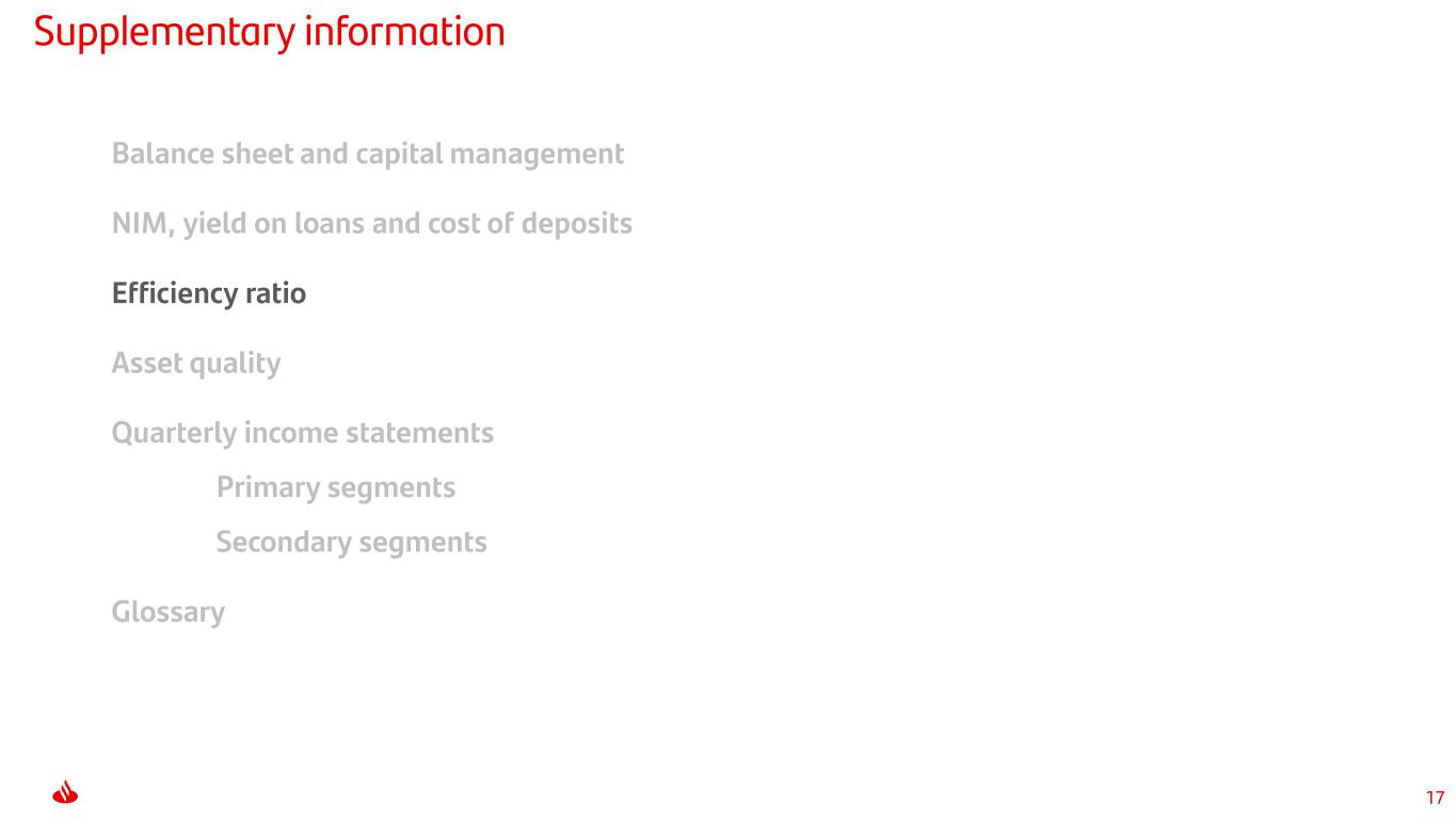 17 Supplementary information Balance sheet and capital management NIM, yield on loans and cost of deposits Efficiency ratio Asset quality Quarterly income statements Primary segments Secondary segments Glossary