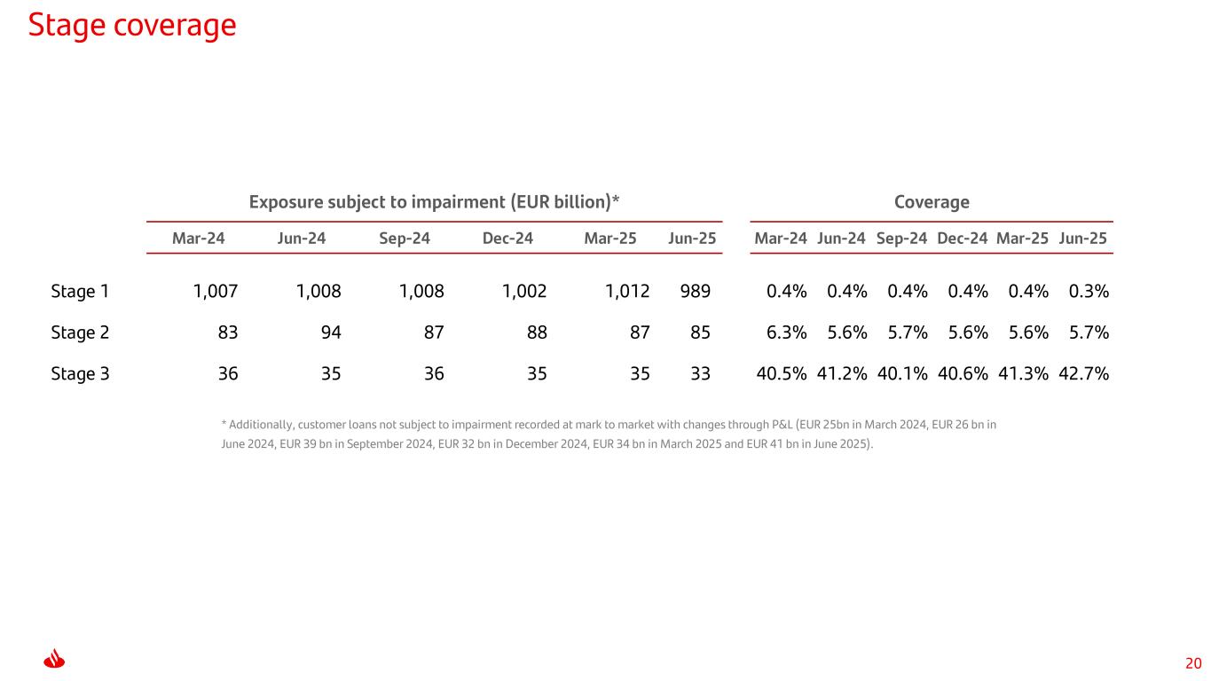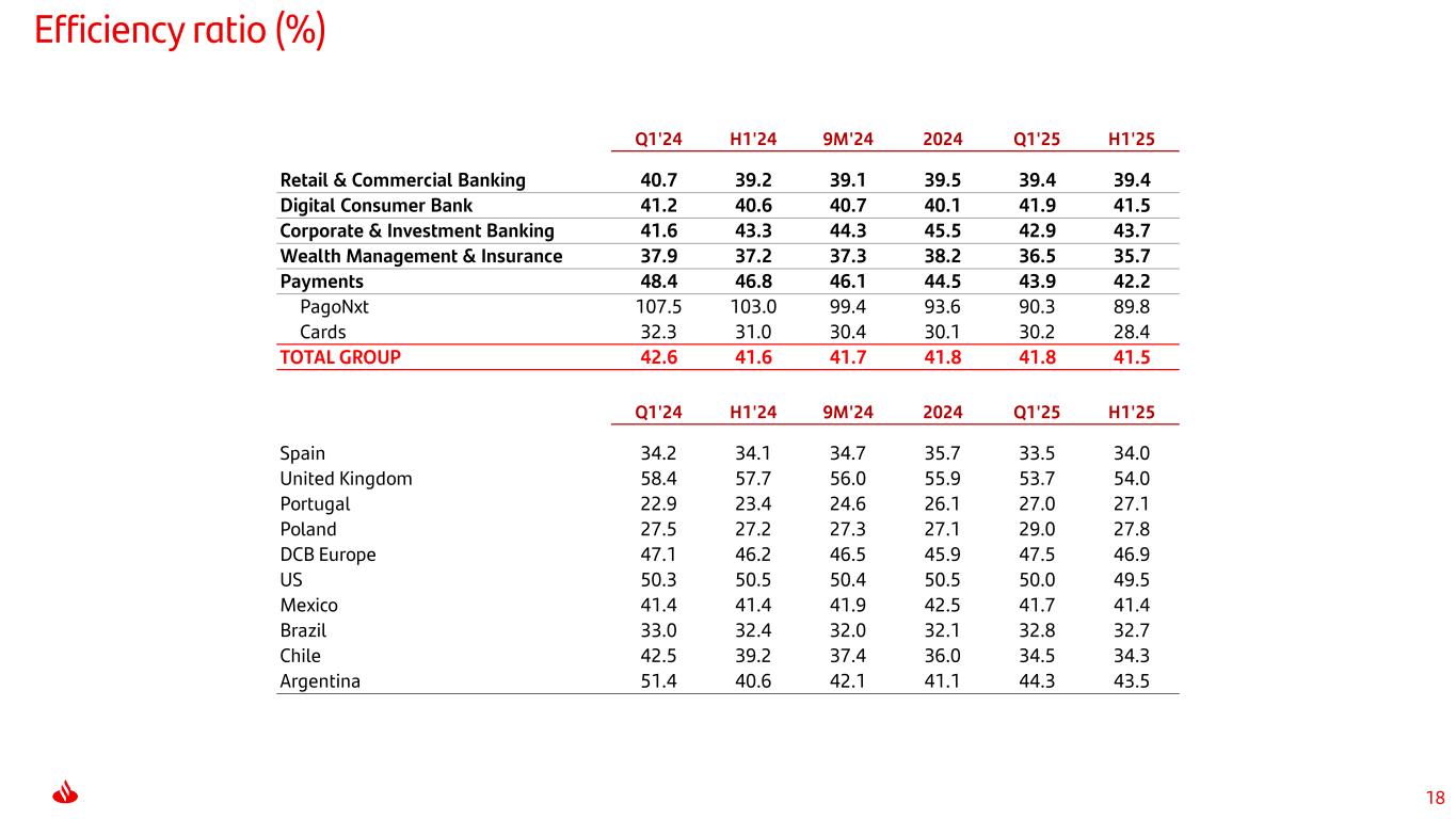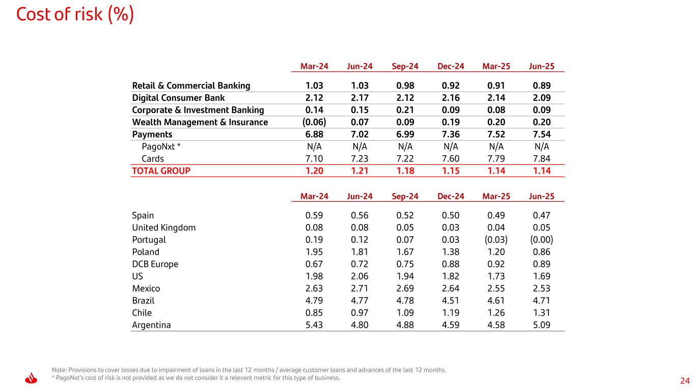 24 Cost of risk (%) Mar-24 Jun-24 Sep-24 Dec-24 Mar-25 Jun-25 Retail & Commercial Banking 1.03 1.03 0.98 0.92 0.91 0.89 Digital Consumer Bank 2.12 2.17 2.12 2.16 2.14 2.09 Corporate & Investment Banking 0.14 0.15 0.21 0.09 0.08 0.09 Wealth Management & Insurance (0.06) 0.07 0.09 0.19 0.20 0.20 Payments 6.88 7.02 6.99 7.36 7.52 7.54 PagoNxt * N/A N/A N/A N/A N/A N/A Cards 7.10 7.23 7.22 7.60 7.79 7.84 TOTAL GROUP 1.20 1.21 1.18 1.15 1.14 1.14 Mar-24 Jun-24 Sep-24 Dec-24 Mar-25 Jun-25 Spain 0.59 0.56 0.52 0.50 0.49 0.47 United Kingdom 0.08 0.08 0.05 0.03 0.04 0.05 Portugal 0.19 0.12 0.07 0.03 (0.03) (0.00) Poland 1.95 1.81 1.67 1.38 1.20 0.86 DCB Europe 0.67 0.72 0.75 0.88 0.92 0.89 US 1.98 2.06 1.94 1.82 1.73 1.69 Mexico 2.63 2.71 2.69 2.64 2.55 2.53 Brazil 4.79 4.77 4.78 4.51 4.61 4.71 Chile 0.85 0.97 1.09 1.19 1.26 1.31 Argentina 5.43 4.80 4.88 4.59 4.58 5.09 Note: Provisions to cover losses due to impairment of loans in the last 12 months / average customer loans and advances of the last 12 months. * PagoNxt’s cost of risk is not provided as we do not consider it a relevant metric for this type of business.