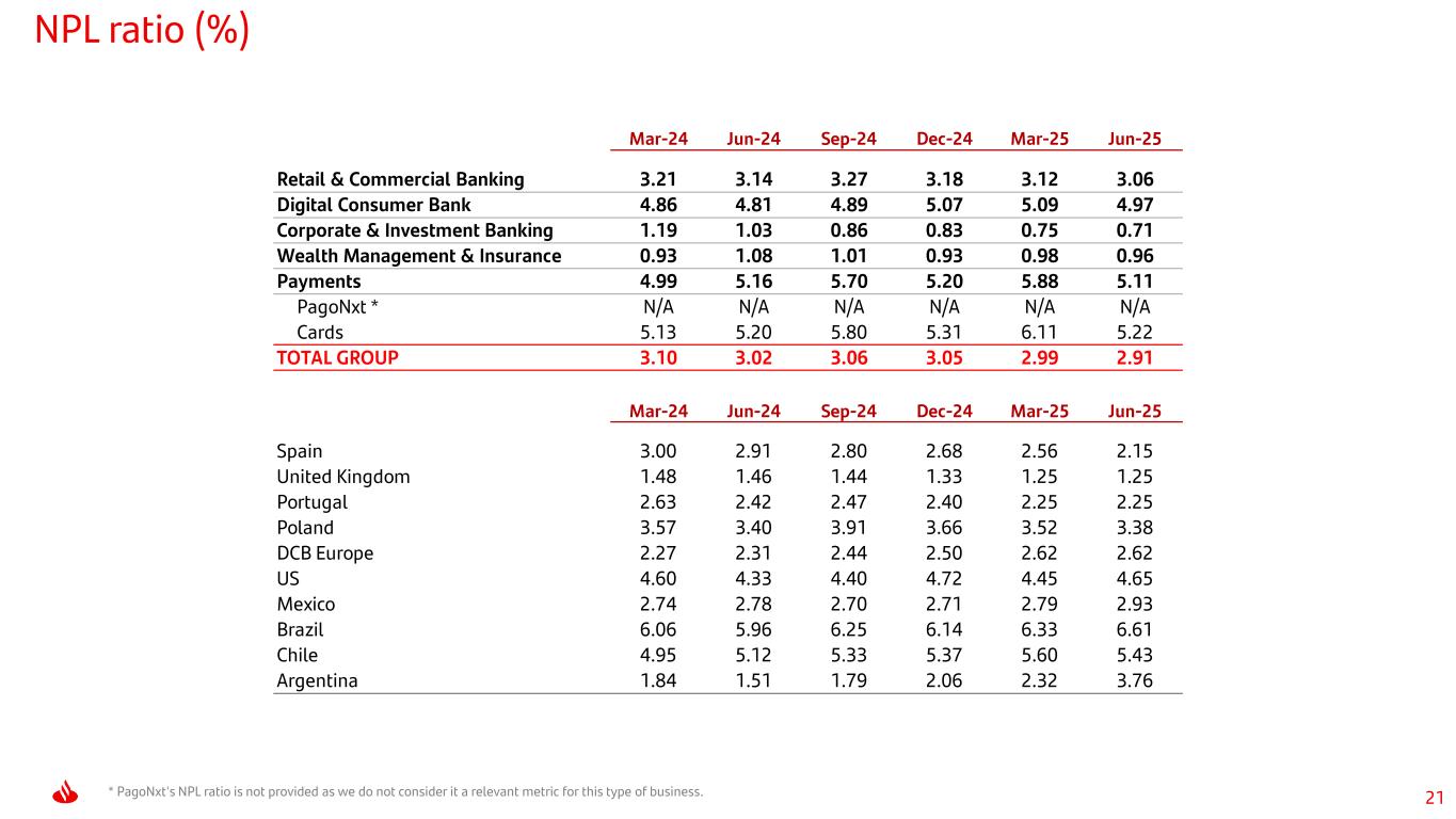 21 NPL ratio (%) Mar-24 Jun-24 Sep-24 Dec-24 Mar-25 Jun-25 Retail & Commercial Banking 3.21 3.14 3.27 3.18 3.12 3.06 Digital Consumer Bank 4.86 4.81 4.89 5.07 5.09 4.97 Corporate & Investment Banking 1.19 1.03 0.86 0.83 0.75 0.71 Wealth Management & Insurance 0.93 1.08 1.01 0.93 0.98 0.96 Payments 4.99 5.16 5.70 5.20 5.88 5.11 PagoNxt * N/A N/A N/A N/A N/A N/A Cards 5.13 5.20 5.80 5.31 6.11 5.22 TOTAL GROUP 3.10 3.02 3.06 3.05 2.99 2.91 Mar-24 Jun-24 Sep-24 Dec-24 Mar-25 Jun-25 Spain 3.00 2.91 2.80 2.68 2.56 2.15 United Kingdom 1.48 1.46 1.44 1.33 1.25 1.25 Portugal 2.63 2.42 2.47 2.40 2.25 2.25 Poland 3.57 3.40 3.91 3.66 3.52 3.38 DCB Europe 2.27 2.31 2.44 2.50 2.62 2.62 US 4.60 4.33 4.40 4.72 4.45 4.65 Mexico 2.74 2.78 2.70 2.71 2.79 2.93 Brazil 6.06 5.96 6.25 6.14 6.33 6.61 Chile 4.95 5.12 5.33 5.37 5.60 5.43 Argentina 1.84 1.51 1.79 2.06 2.32 3.76 * PagoNxt's NPL ratio is not provided as we do not consider it a relevant metric for this type of business.