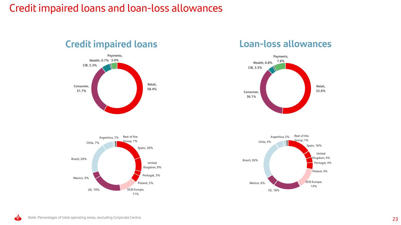 23 Loan-loss allowancesCredit impaired loans Credit impaired loans and loan-loss allowances Retail, 58.4% Consumer, 31.7% CIB, 5.3% Wealth, 0.7% Payments, 3.9% Retail, 52.0%Consumer, 36.1% CIB, 3.5% Wealth, 0.8% Payments, 7.6% Spain, 20% United Kingdom, 9% Portugal, 3% Poland, 5% DCB Europe, 11% US, 19% Mexico, 4% Brazil, 20% Chile, 7% Argentina, 1% Rest of the Group, 1% Spain, 16% United Kingdom, 4% Portugal, 4% Poland, 4% DCB Europe, 14% US, 18% Mexico, 6% Brazil, 26% Chile, 5% Argentina, 2% Rest of the Group, 1% Note: Percentages of total operating areas, excluding Corporate Centre.