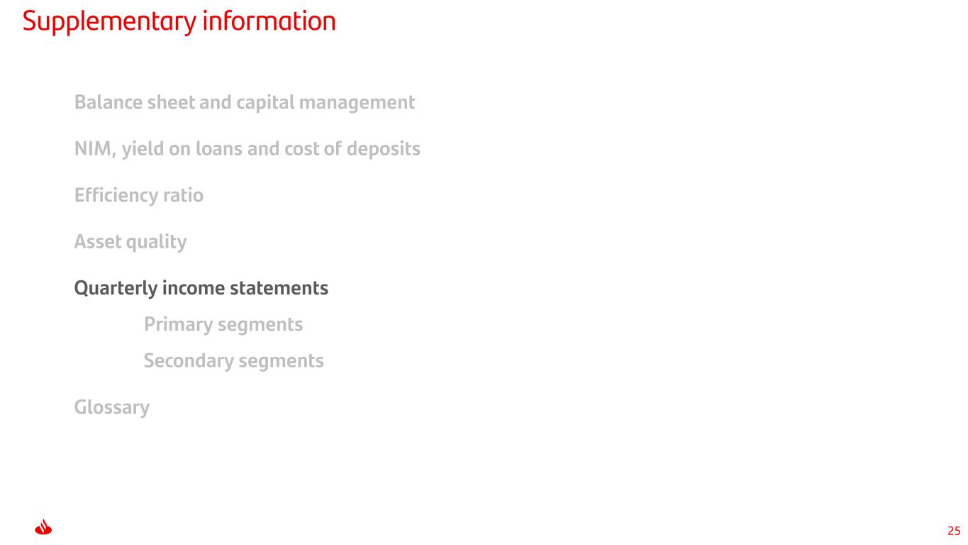 25 Supplementary information Balance sheet and capital management NIM, yield on loans and cost of deposits Efficiency ratio Asset quality Quarterly income statements Primary segments Secondary segments Glossary