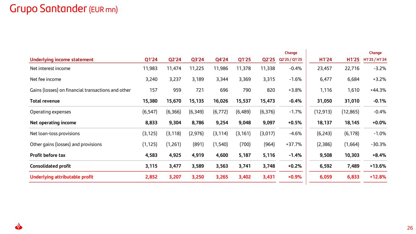 27 GRUPO SANTANDER (Constant EUR mn) Change Change Underlying income statement Q1'24 Q2'24 Q3'24 Q4'24 Q1'25 Q2'25 Q2'25 / Q1'25 H1'24 H1'25 H1'25 / H1'24 Net interest income 11,425 10,991 11,106 11,894 11,219 11,497 +2.5% 22,416 22,716 +1.3% Net fee income 3,060 3,074 3,147 3,317 3,324 3,360 +1.1% 6,135 6,684 +9.0% Gains (losses) on financial transactions and other 143 945 723 681 779 831 +6.6% 1,088 1,610 +48.0% Total revenue 14,629 15,010 14,976 15,891 15,322 15,688 +2.4% 29,639 31,010 +4.6% Operating expenses (6,278) (6,128) (6,294) (6,706) (6,399) (6,466) +1.0% (12,406) (12,865) +3.7% Net operating income 8,350 8,882 8,682 9,185 8,923 9,222 +3.4% 17,233 18,145 +5.3% Net loan-loss provisions (2,893) (2,930) (2,931) (3,084) (3,105) (3,073) -1.0% (5,823) (6,178) +6.1% Other gains (losses) and provisions (1,095) (1,232) (887) (1,541) (693) (971) +40.1% (2,327) (1,664) -28.5% Profit before tax 4,362 4,721 4,864 4,560 5,124 5,179 +1.1% 9,083 10,303 +13.4% Consolidated profit 2,966 3,331 3,545 3,523 3,692 3,797 +2.8% 6,297 7,489 +18.9% Underlying attributable profit 2,710 3,069 3,209 3,226 3,357 3,476 +3.5% 5,778 6,833 +18.3%
