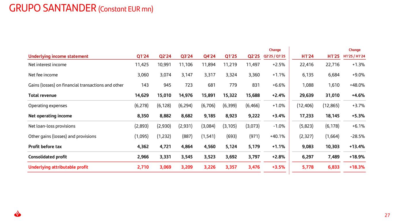 26 Grupo Santander (EUR mn) Change Change Underlying income statement Q1'24 Q2'24 Q3'24 Q4'24 Q1'25 Q2'25 Q2'25 / Q1'25 H1'24 H1'25 H1'25 / H1'24 Net interest income 11,983 11,474 11,225 11,986 11,378 11,338 -0.4% 23,457 22,716 -3.2% Net fee income 3,240 3,237 3,189 3,344 3,369 3,315 -1.6% 6,477 6,684 +3.2% Gains (losses) on financial transactions and other 157 959 721 696 790 820 +3.8% 1,116 1,610 +44.3% Total revenue 15,380 15,670 15,135 16,026 15,537 15,473 -0.4% 31,050 31,010 -0.1% Operating expenses (6,547) (6,366) (6,349) (6,772) (6,489) (6,376) -1.7% (12,913) (12,865) -0.4% Net operating income 8,833 9,304 8,786 9,254 9,048 9,097 +0.5% 18,137 18,145 +0.0% Net loan-loss provisions (3,125) (3,118) (2,976) (3,114) (3,161) (3,017) -4.6% (6,243) (6,178) -1.0% Other gains (losses) and provisions (1,125) (1,261) (891) (1,540) (700) (964) +37.7% (2,386) (1,664) -30.3% Profit before tax 4,583 4,925 4,919 4,600 5,187 5,116 -1.4% 9,508 10,303 +8.4% Consolidated profit 3,115 3,477 3,589 3,563 3,741 3,748 +0.2% 6,592 7,489 +13.6% Underlying attributable profit 2,852 3,207 3,250 3,265 3,402 3,431 +0.9% 6,059 6,833 +12.8%