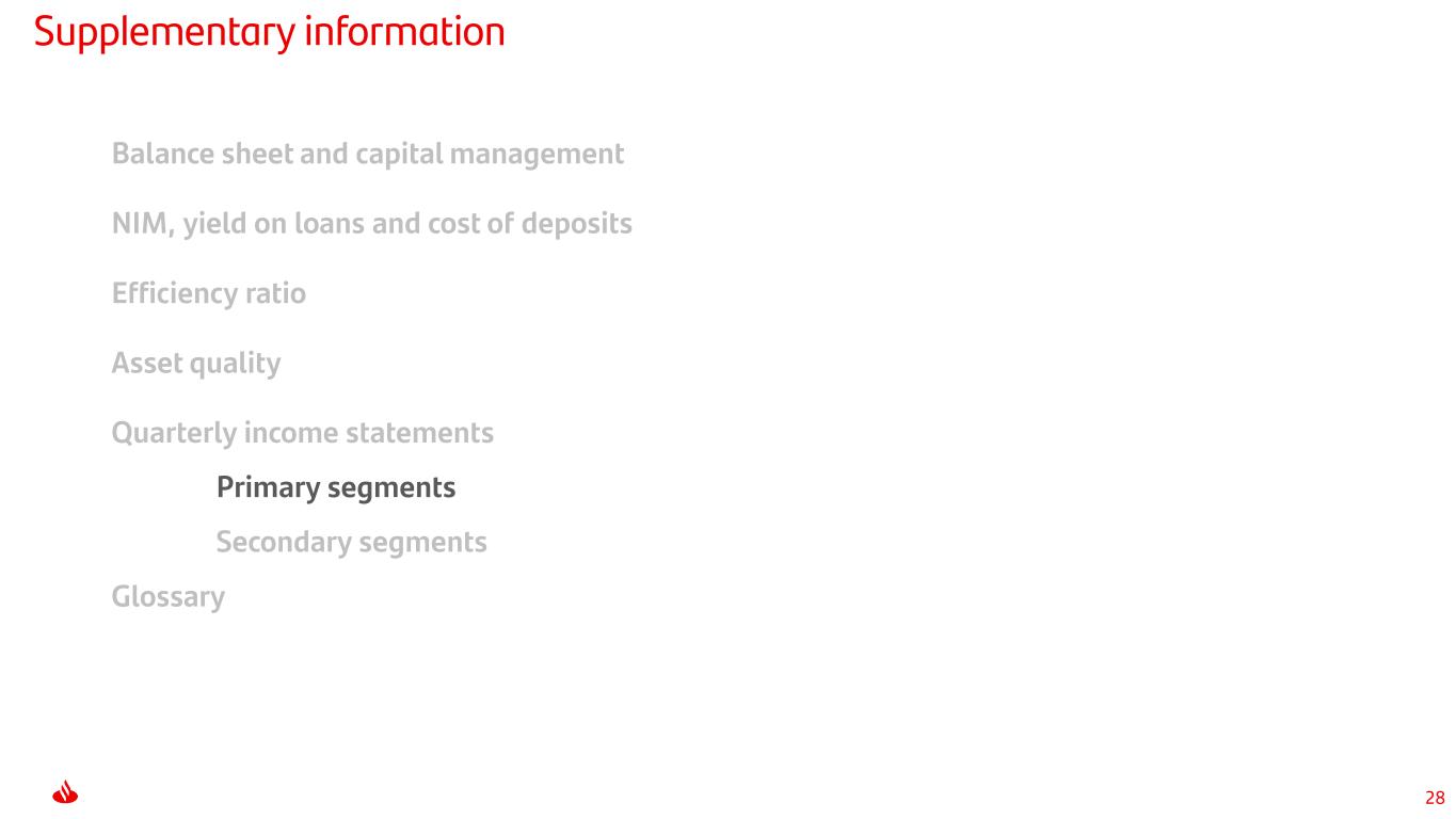 28 Supplementary information Balance sheet and capital management NIM, yield on loans and cost of deposits Efficiency ratio Asset quality Quarterly income statements Primary segments Secondary segments Glossary