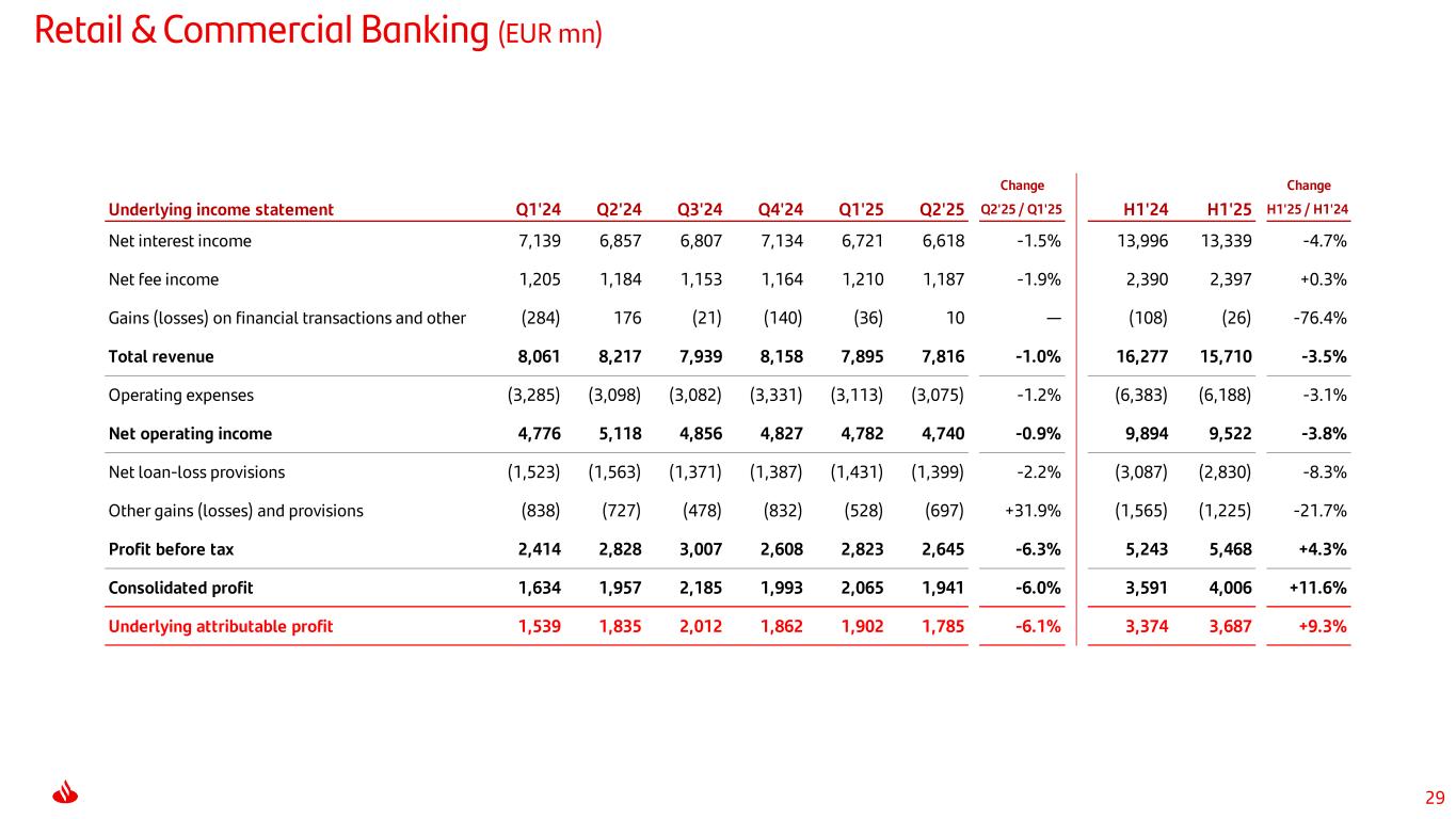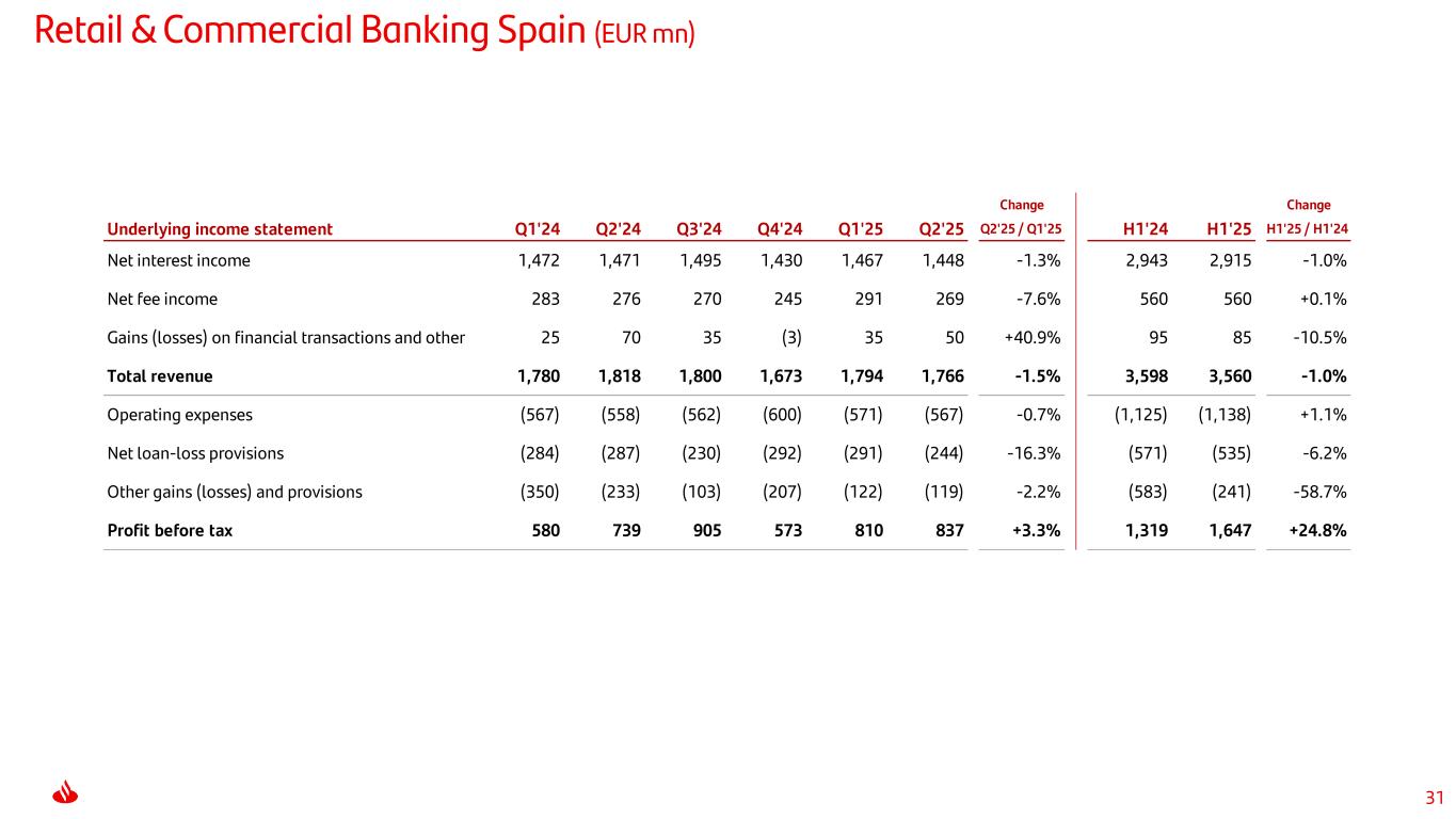30 Retail & Commercial Banking (Constant EUR mn) Change Change Underlying income statement Q1'24 Q2'24 Q3'24 Q4'24 Q1'25 Q2'25 Q2'25 / Q1'25 H1'24 H1'25 H1'25 / H1'24 Net interest income 6,781 6,554 6,719 7,090 6,647 6,693 +0.7% 13,335 13,339 +0.0% Net fee income 1,121 1,107 1,133 1,160 1,195 1,201 +0.5% 2,228 2,397 +7.6% Gains (losses) on financial transactions and other (276) 169 (10) (141) (35) 9 — (107) (26) -76.2% Total revenue 7,625 7,831 7,841 8,108 7,807 7,903 +1.2% 15,456 15,710 +1.6% Operating expenses (3,104) (2,947) (3,039) (3,298) (3,075) (3,113) +1.2% (6,051) (6,188) +2.3% Net operating income 4,521 4,884 4,802 4,810 4,732 4,790 +1.2% 9,405 9,522 +1.2% Net loan-loss provisions (1,383) (1,449) (1,342) (1,381) (1,409) (1,421) +0.9% (2,832) (2,830) -0.1% Other gains (losses) and provisions (813) (702) (475) (833) (523) (702) +34.4% (1,515) (1,225) -19.2% Profit before tax 2,325 2,733 2,986 2,596 2,801 2,667 -4.8% 5,058 5,468 +8.1% Consolidated profit 1,574 1,886 2,166 1,981 2,047 1,958 -4.3% 3,460 4,006 +15.8% Underlying attributable profit 1,480 1,768 1,992 1,848 1,886 1,801 -4.5% 3,248 3,687 +13.5%