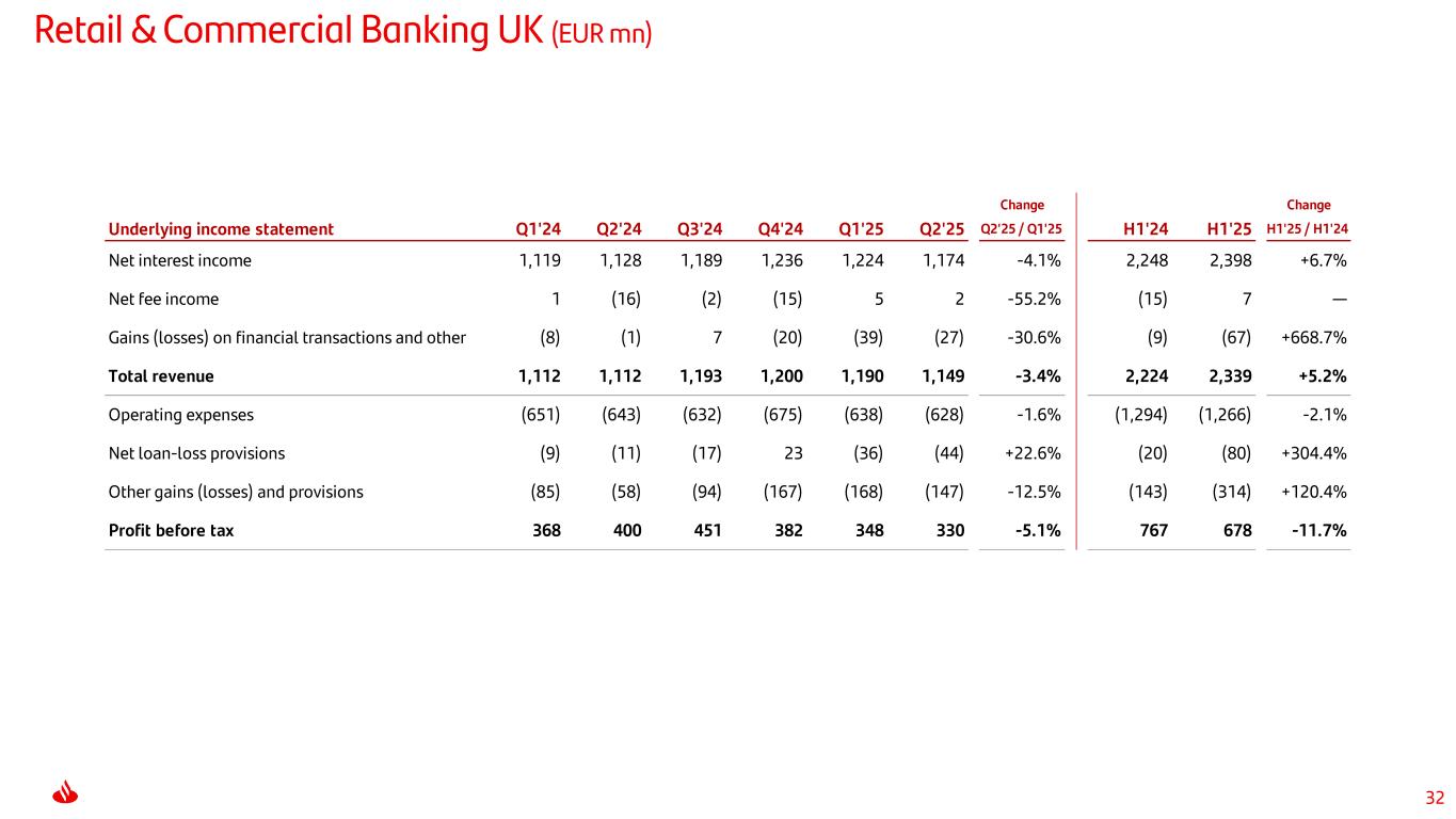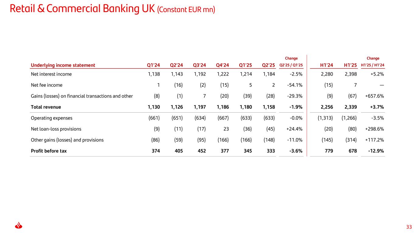 32 Retail & Commercial Banking UK (EUR mn) Change Change Underlying income statement Q1'24 Q2'24 Q3'24 Q4'24 Q1'25 Q2'25 Q2'25 / Q1'25 H1'24 H1'25 H1'25 / H1'24 Net interest income 1,119 1,128 1,189 1,236 1,224 1,174 -4.1% 2,248 2,398 +6.7% Net fee income 1 (16) (2) (15) 5 2 -55.2% (15) 7 — Gains (losses) on financial transactions and other (8) (1) 7 (20) (39) (27) -30.6% (9) (67) +668.7% Total revenue 1,112 1,112 1,193 1,200 1,190 1,149 -3.4% 2,224 2,339 +5.2% Operating expenses (651) (643) (632) (675) (638) (628) -1.6% (1,294) (1,266) -2.1% Net loan-loss provisions (9) (11) (17) 23 (36) (44) +22.6% (20) (80) +304.4% Other gains (losses) and provisions (85) (58) (94) (167) (168) (147) -12.5% (143) (314) +120.4% Profit before tax 368 400 451 382 348 330 -5.1% 767 678 -11.7%