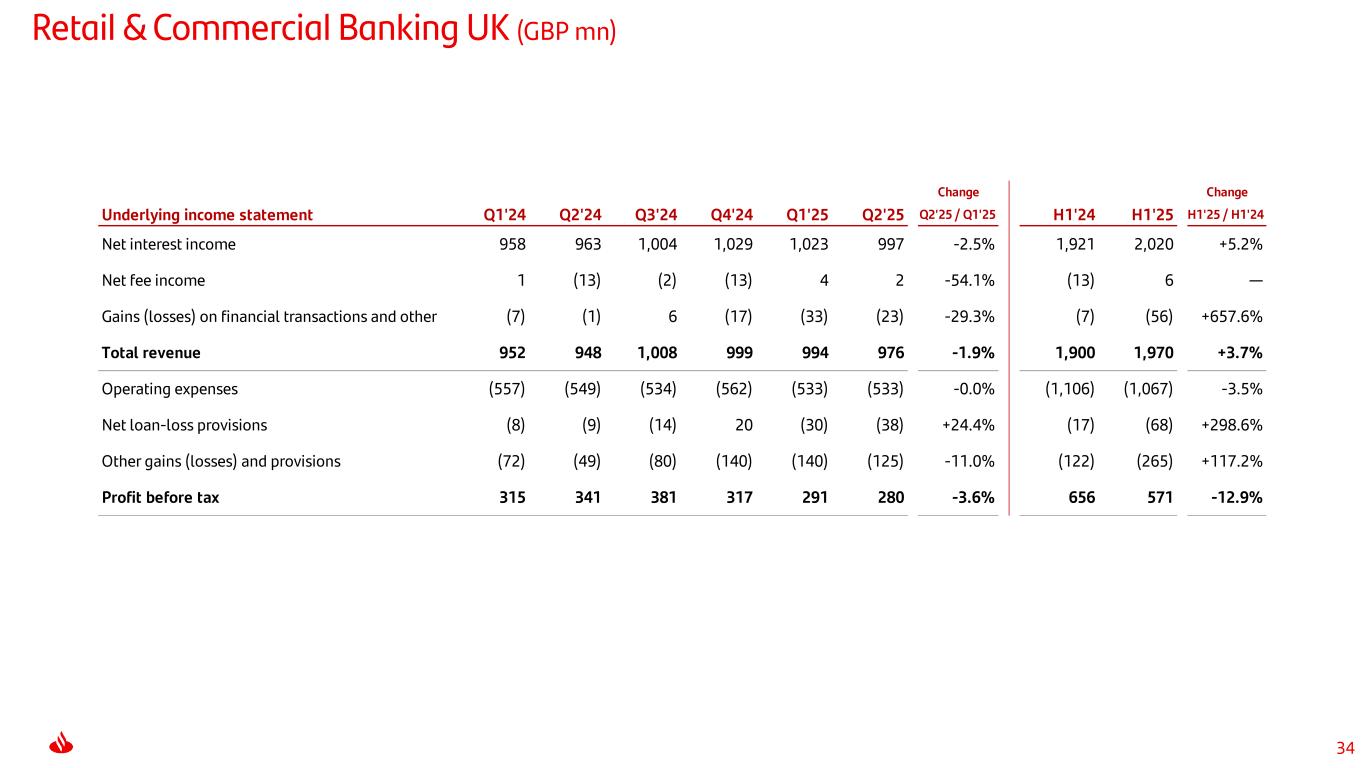 33 Retail & Commercial Banking UK (Constant EUR mn) Change Change Underlying income statement Q1'24 Q2'24 Q3'24 Q4'24 Q1'25 Q2'25 Q2'25 / Q1'25 H1'24 H1'25 H1'25 / H1'24 Net interest income 1,138 1,143 1,192 1,222 1,214 1,184 -2.5% 2,280 2,398 +5.2% Net fee income 1 (16) (2) (15) 5 2 -54.1% (15) 7 — Gains (losses) on financial transactions and other (8) (1) 7 (20) (39) (28) -29.3% (9) (67) +657.6% Total revenue 1,130 1,126 1,197 1,186 1,180 1,158 -1.9% 2,256 2,339 +3.7% Operating expenses (661) (651) (634) (667) (633) (633) -0.0% (1,313) (1,266) -3.5% Net loan-loss provisions (9) (11) (17) 23 (36) (45) +24.4% (20) (80) +298.6% Other gains (losses) and provisions (86) (59) (95) (166) (166) (148) -11.0% (145) (314) +117.2% Profit before tax 374 405 452 377 345 333 -3.6% 779 678 -12.9%