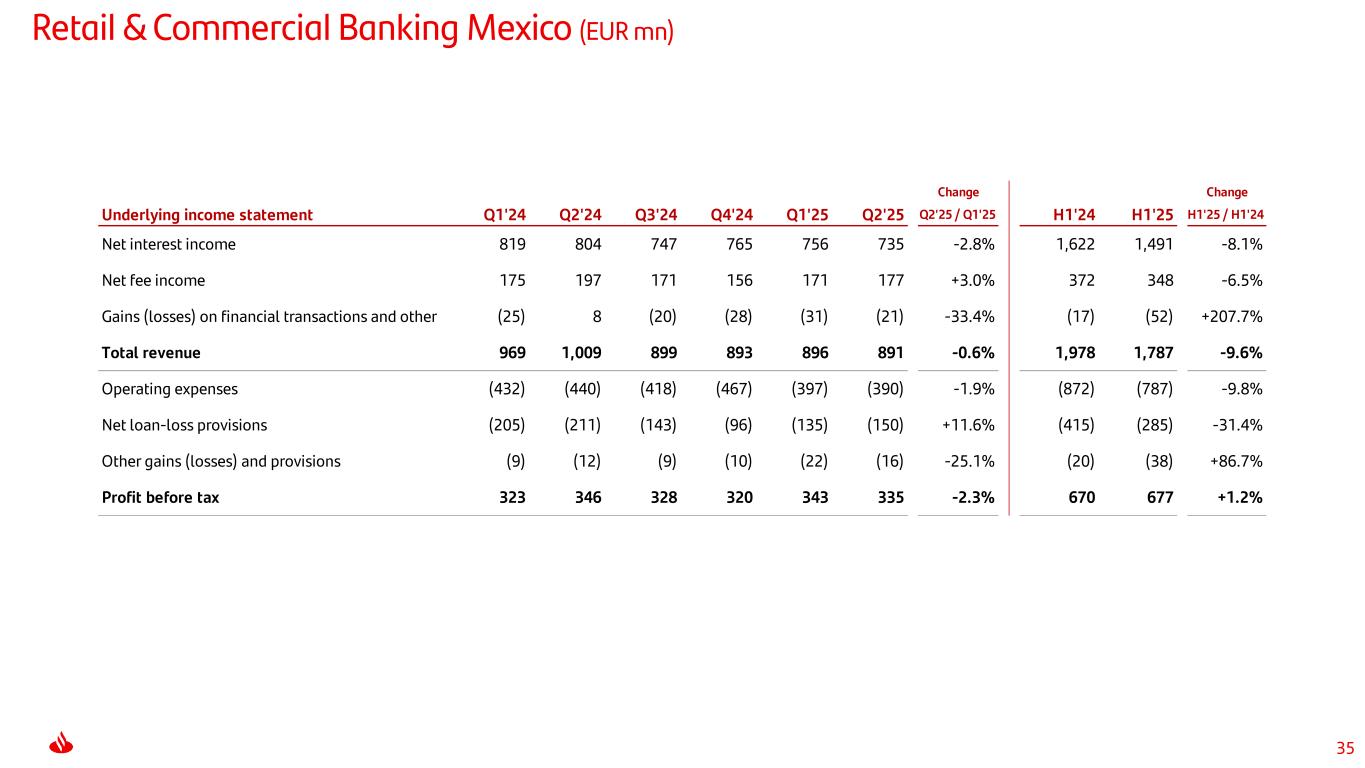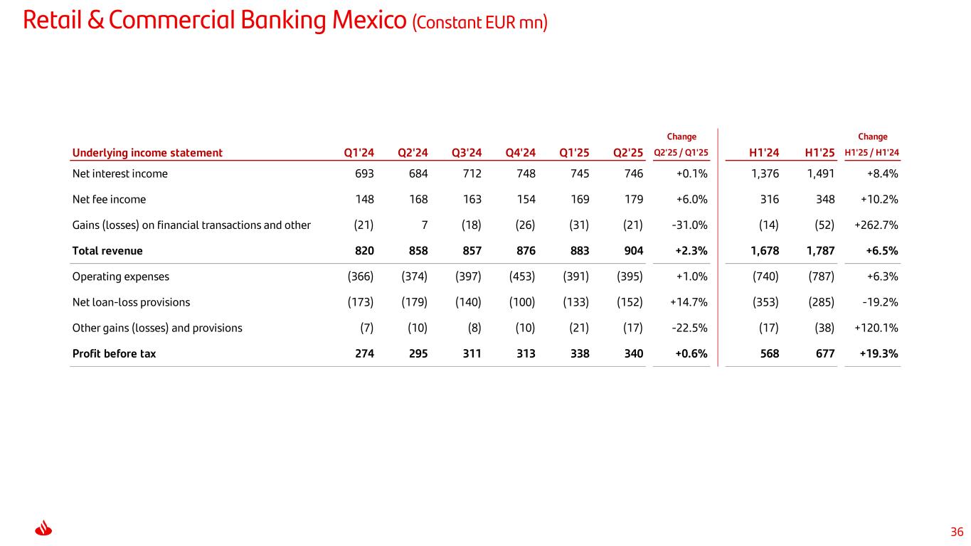 35 Retail & Commercial Banking Mexico (EUR mn) Change Change Underlying income statement Q1'24 Q2'24 Q3'24 Q4'24 Q1'25 Q2'25 Q2'25 / Q1'25 H1'24 H1'25 H1'25 / H1'24 Net interest income 819 804 747 765 756 735 -2.8% 1,622 1,491 -8.1% Net fee income 175 197 171 156 171 177 +3.0% 372 348 -6.5% Gains (losses) on financial transactions and other (25) 8 (20) (28) (31) (21) -33.4% (17) (52) +207.7% Total revenue 969 1,009 899 893 896 891 -0.6% 1,978 1,787 -9.6% Operating expenses (432) (440) (418) (467) (397) (390) -1.9% (872) (787) -9.8% Net loan-loss provisions (205) (211) (143) (96) (135) (150) +11.6% (415) (285) -31.4% Other gains (losses) and provisions (9) (12) (9) (10) (22) (16) -25.1% (20) (38) +86.7% Profit before tax 323 346 328 320 343 335 -2.3% 670 677 +1.2%